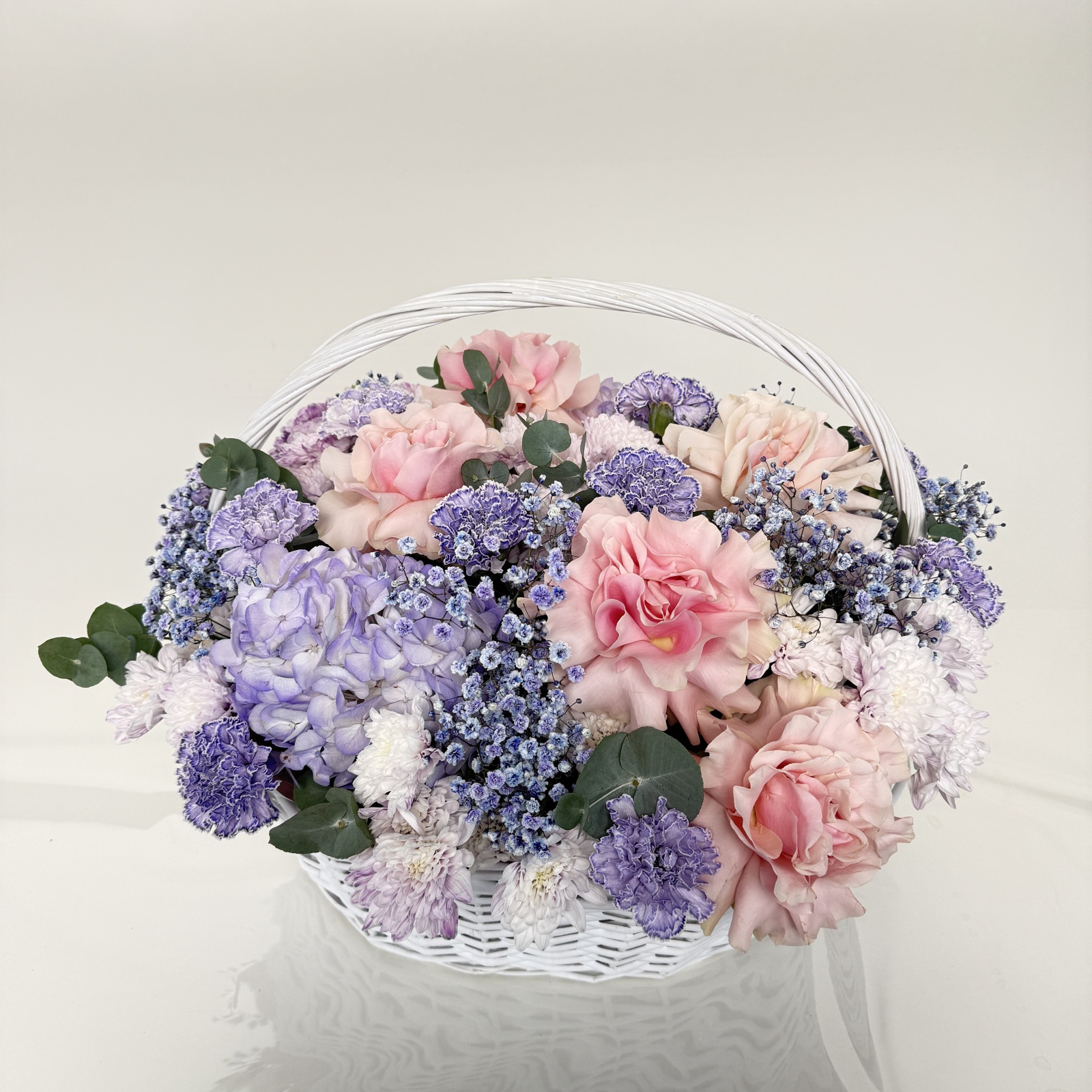 Состав: гвоздика 10, хризантема кустовая 6, гипсофила 5, роза 5, гортензия 3, эвкалипт 2 и прочее. в наличии