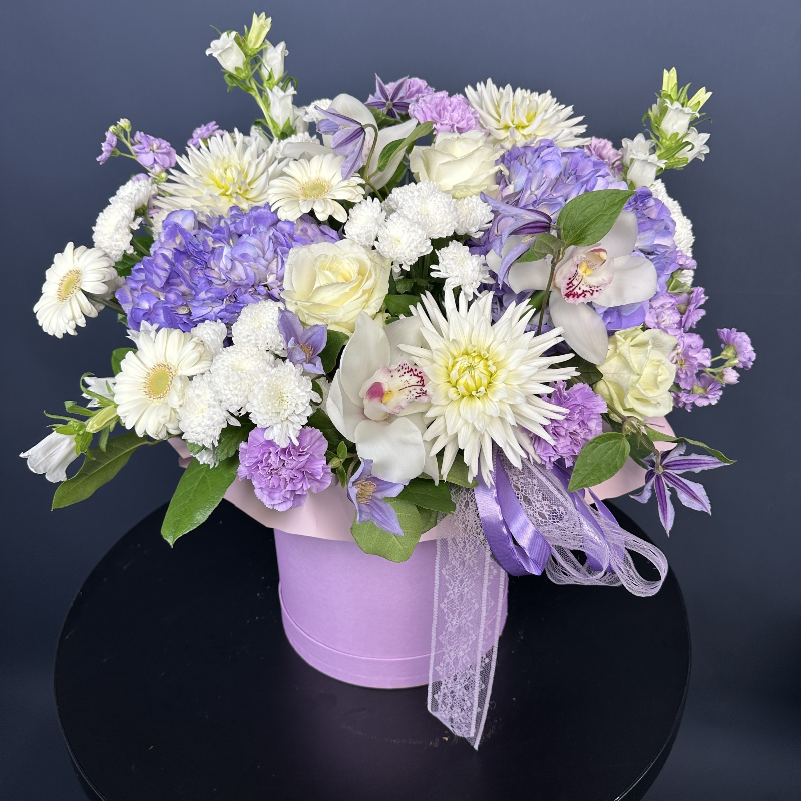 Состав: гвоздика 5, хризантема 5, роза 3, гербера 3, гортензия 2, клематис 2, маттиола 2, дельфиниум 1, ветка цимбидиум 0,25 и прочее.