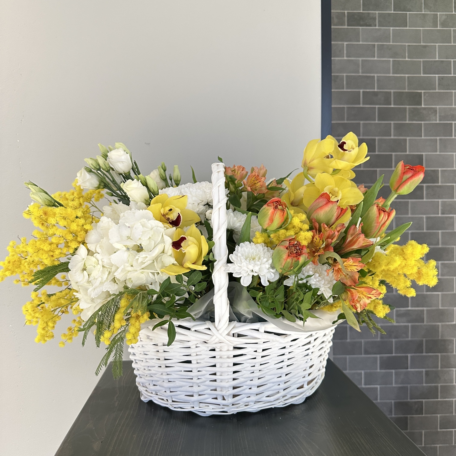 Состав: тюльпан 5, альстромерия 3, гортензия 2, лизиантус 1, ветка цимбидиум 1, хризантема кустовая 1, фисташка 0,5 и прочее. под заказ