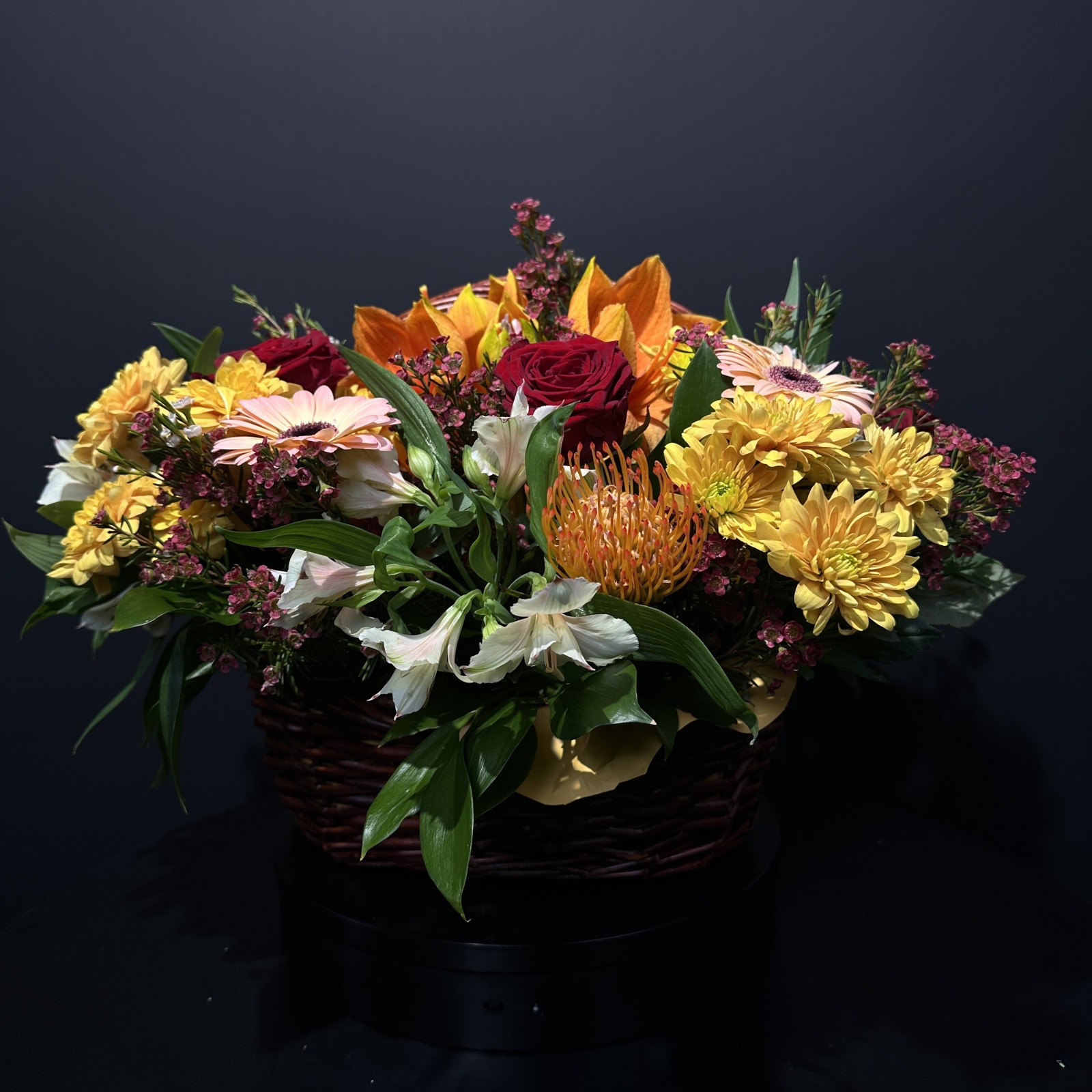 Состав: роза 4, альстромерия 4, хризантема кустовая 3, гербера 3, гиппеаструм 1 и прочее. под заказ