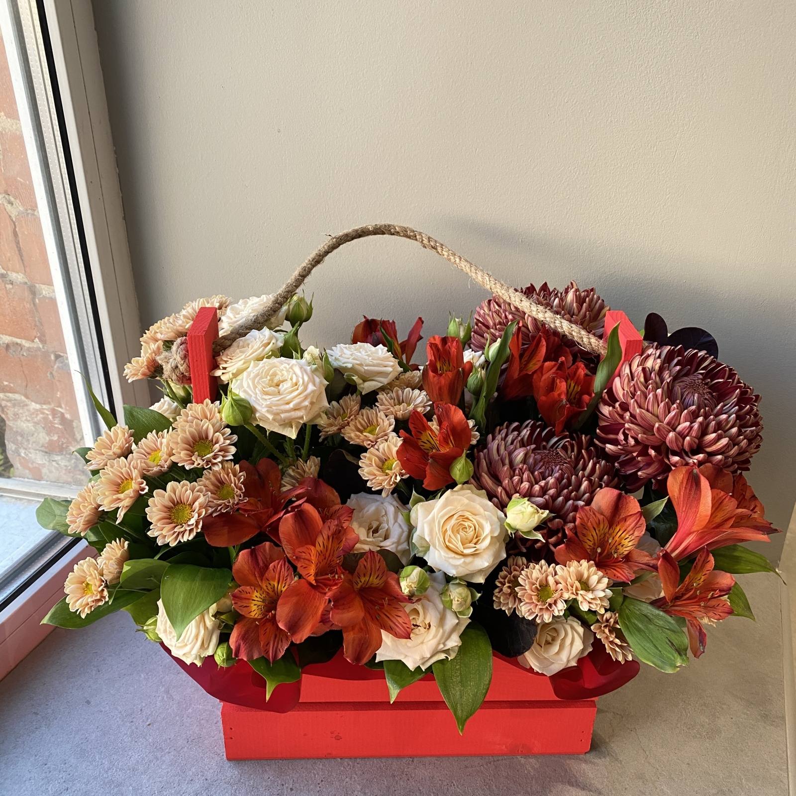 Состав: хризантема 6, альстромерия 3, роза кустовая 1, рускус 0,3 и прочее.