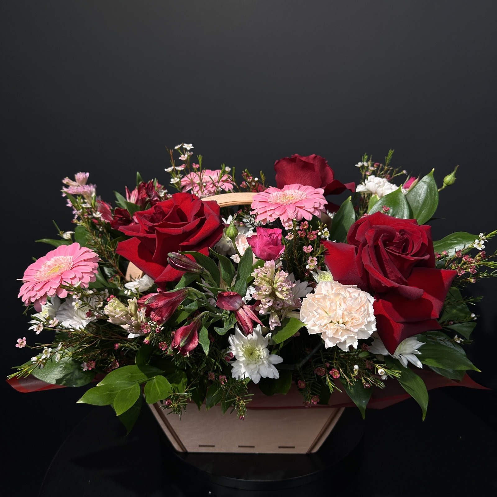Состав: гвоздика 3, гербера 3, роза 3, альстромерия 2, гиацинт 2, рускус 0,5 и прочее.