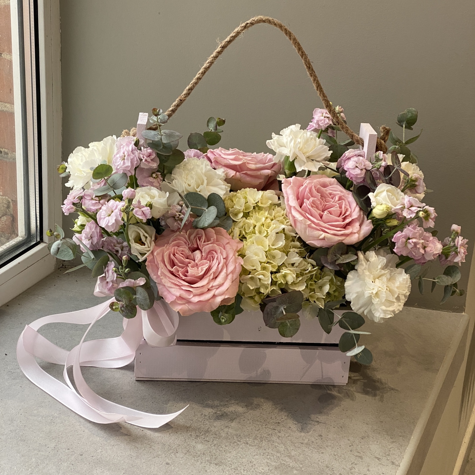 Состав: гвоздика 6, роза 3, маттиола 3, эвкалипт 2, гортензия 2, роза кустовая 1 и прочее.