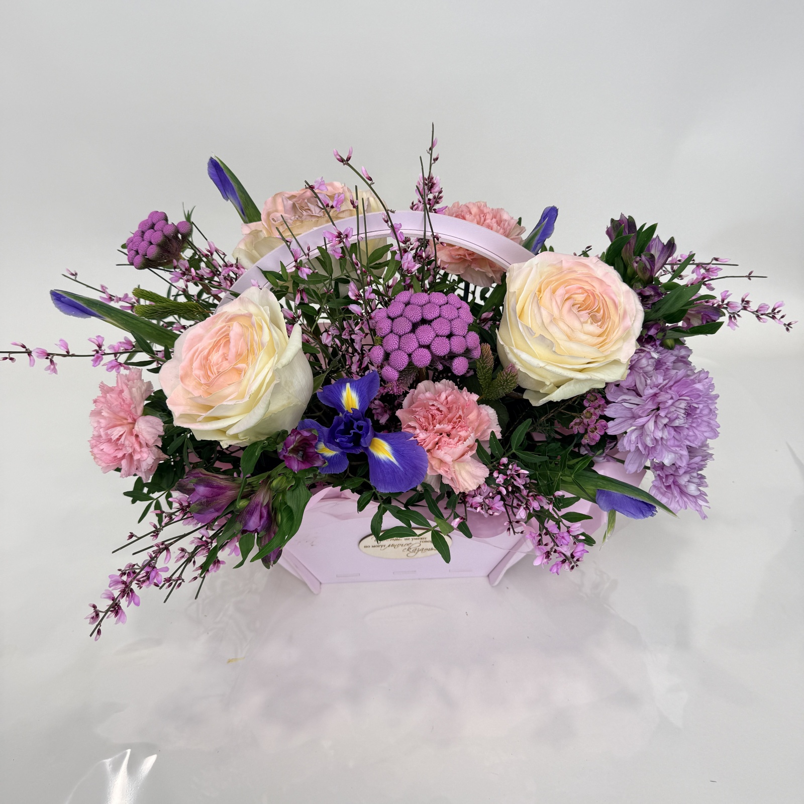 Состав: ирис 5, роза 3, гвоздика 3, альстромерия 2, бруния 2, гиперикум 1, фисташка 0,25 и прочее. в наличии