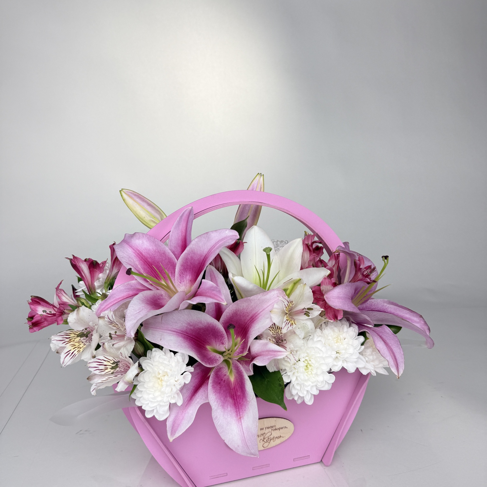 Состав: альстромерия 5, хризантема кустовая 2, лилия 2, рускус 0,5 и прочее. в наличии