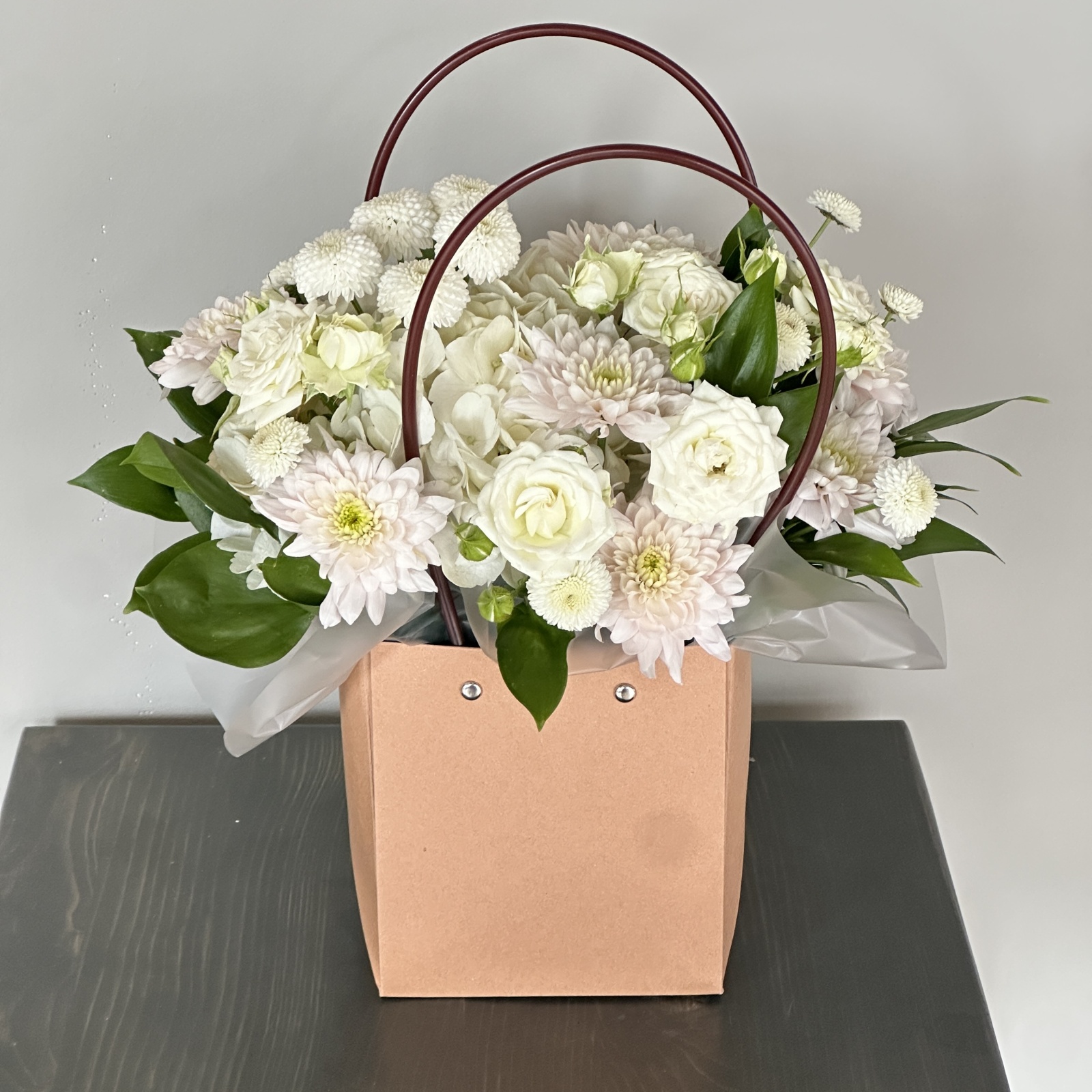 Состав: хризантема кустовая 2, гортензия 1, роза кустовая 1, рускус 0,1 и прочее. под заказ