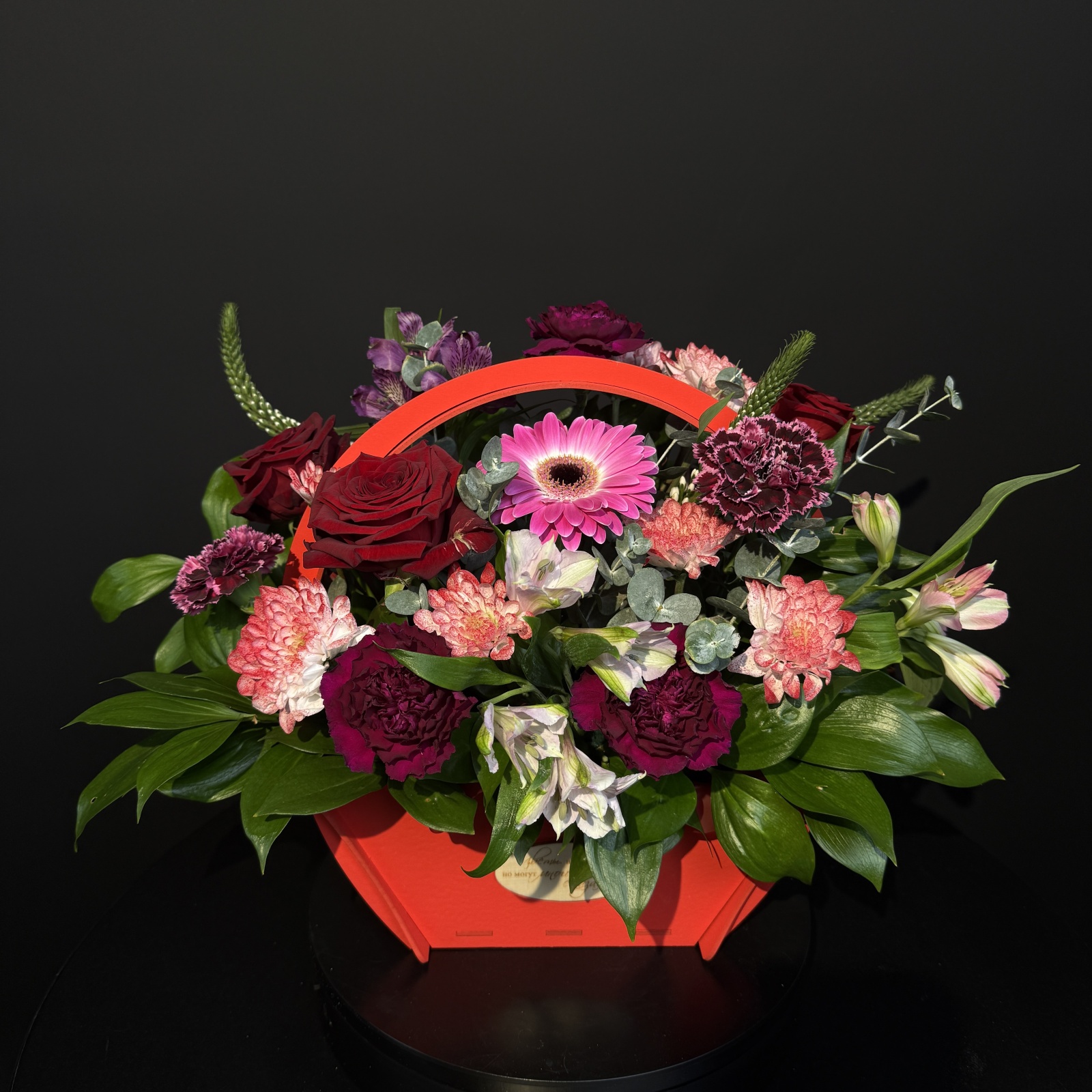 Состав: гвоздика 5, роза 3, альстромерия 3, лизимахия 3, эвкалипт 1, хризантема кустовая 1, гербера 1, рускус 0,5 и прочее. под заказ