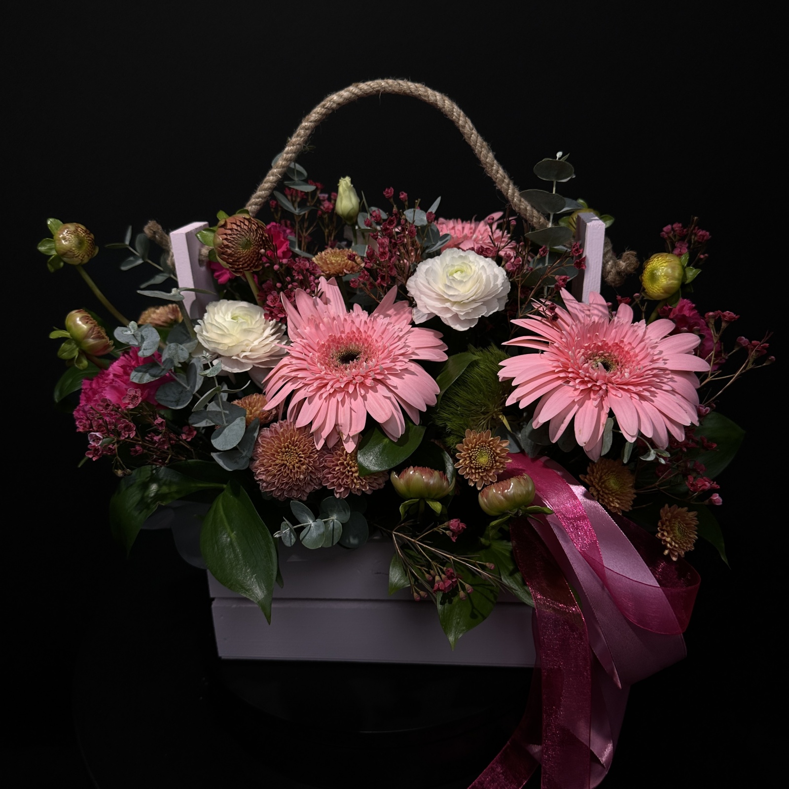 Состав: гвоздика 4, гербера 3, хамелациум 3, хризантема 3, эвкалипт 1, рускус 1 и прочее.