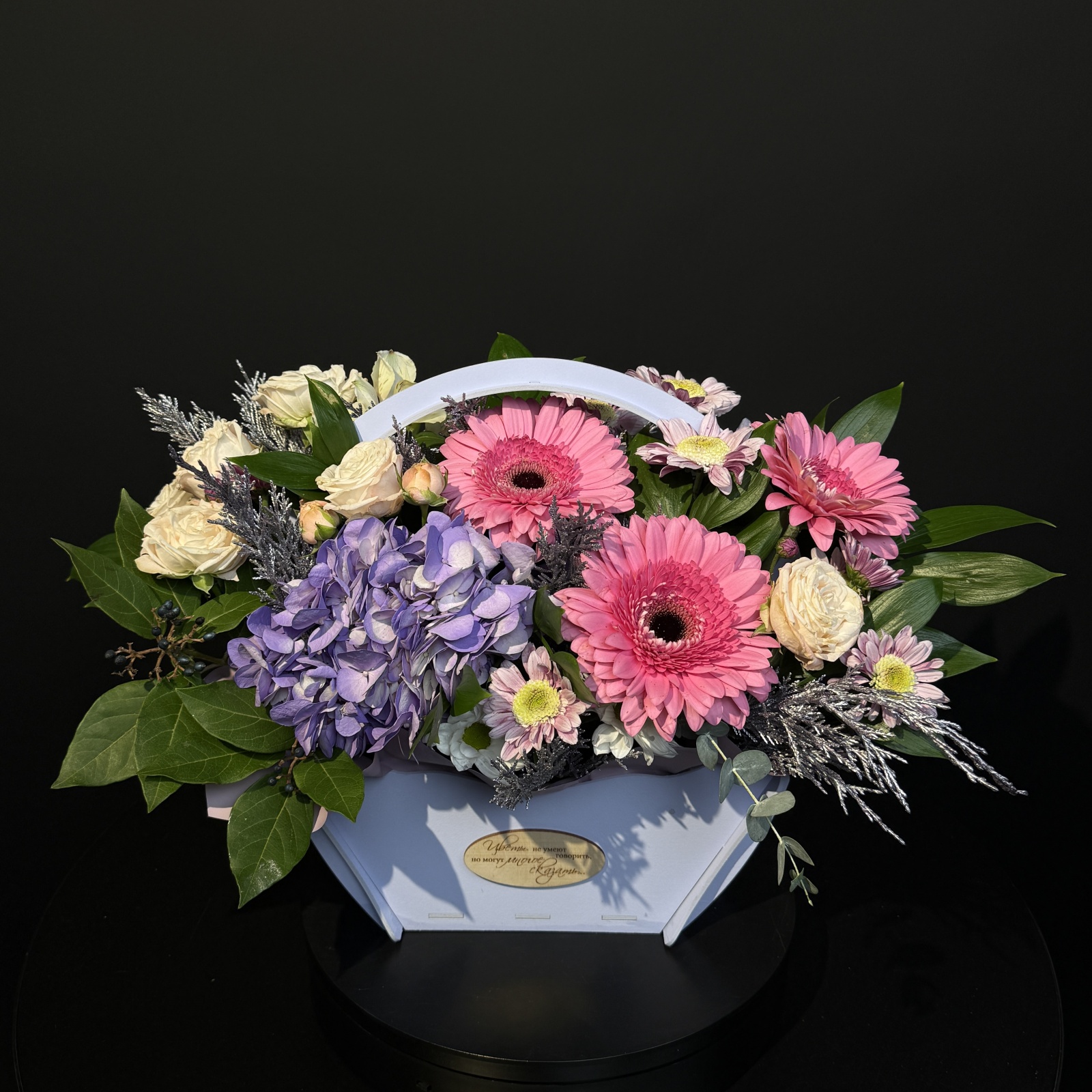 Состав: гербера 3, гортензия 1, альстромерия 1, роза кустовая 1, хризантема кустовая 1, рускус 0,5 и прочее. в наличии