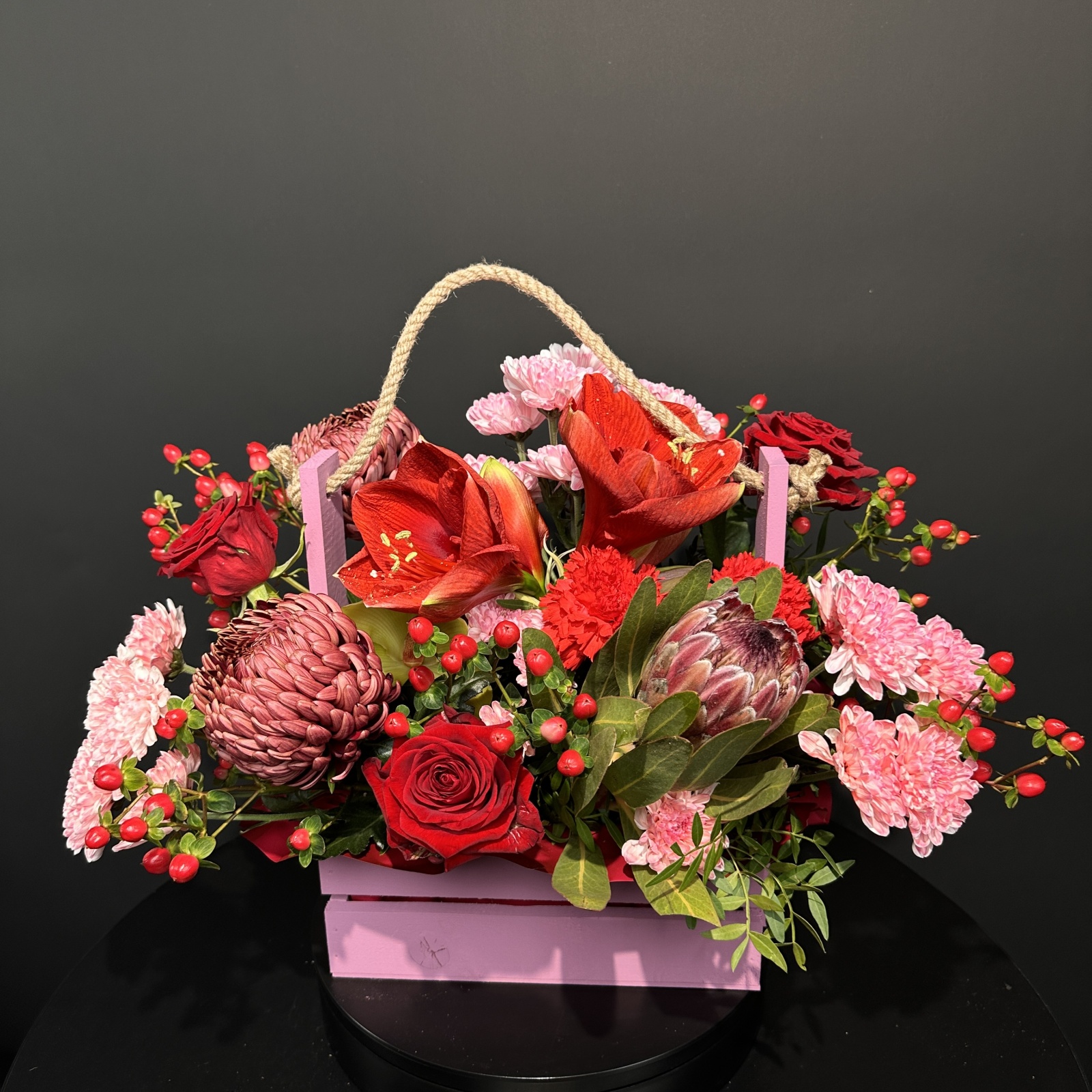 Состав: роза 3, гвоздика 3, гиперикум 3, хризантема 2, гиппеаструм 1, хризантема кустовая 1 и прочее.