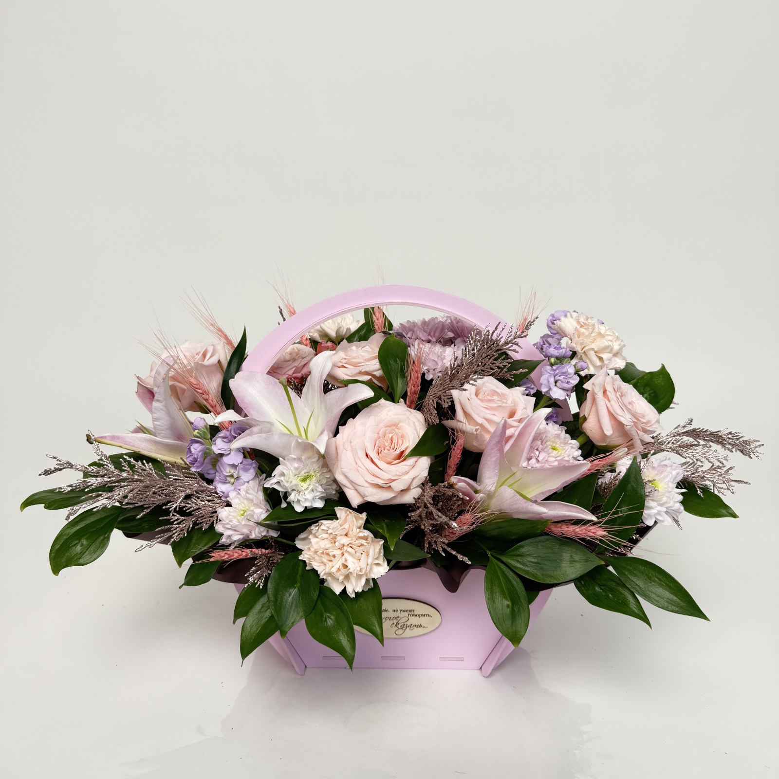 Состав: роза 5, гвоздика 5, хризантема кустовая 1, маттиола 1, рускус 0,5 и прочее.