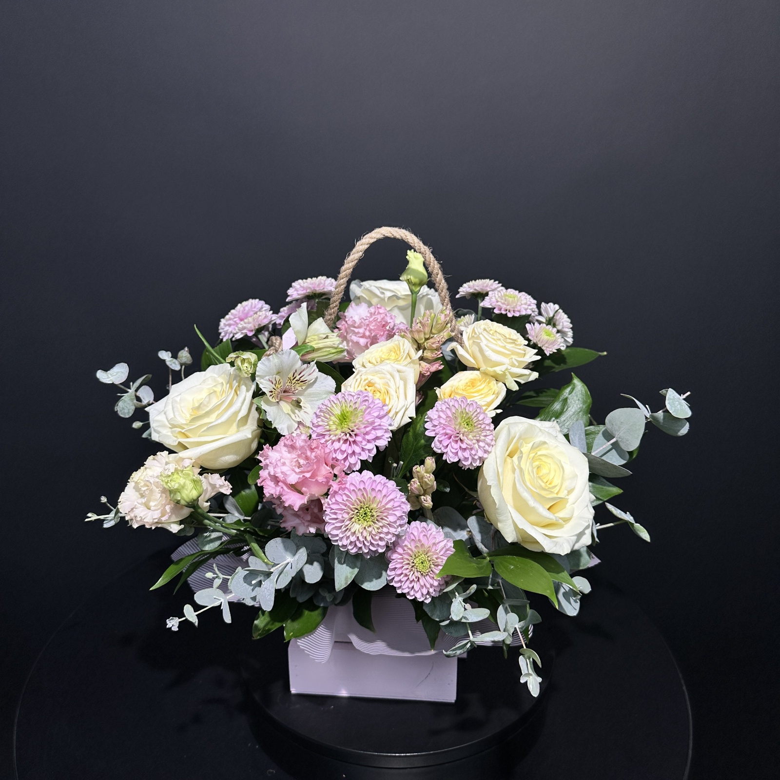 Состав: роза 3, хризантема кустовая 3, гиацинт 1, альстромерия 1, роза кустовая 1, лизиантус 1, эвкалипт 1, рускус 0,9 и прочее.