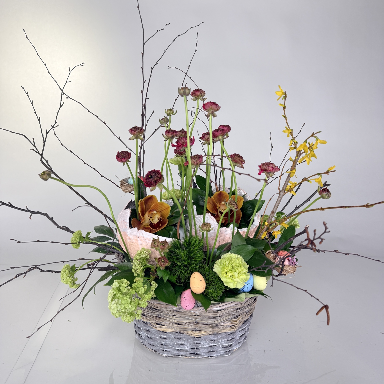Состав: гвоздика 3, гортензия 1, ранункулюс 1, фисташка 0,5, ветка цимбидиум 0,2 и прочее. в наличии