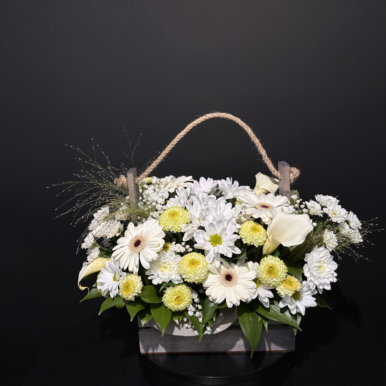 Состав: гербера 5, хризантема кустовая 4, хризантема 2, гипсофила 1, рускус 0,3 и прочее. под заказ