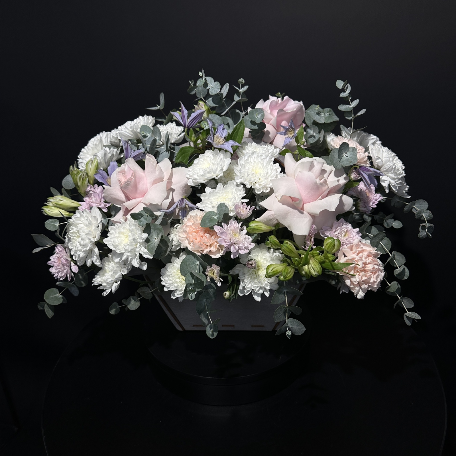 Состав: хризантема кустовая 4, альстромерия 3, клематис 3, эвкалипт 3, гвоздика 3, роза 3 и прочее.