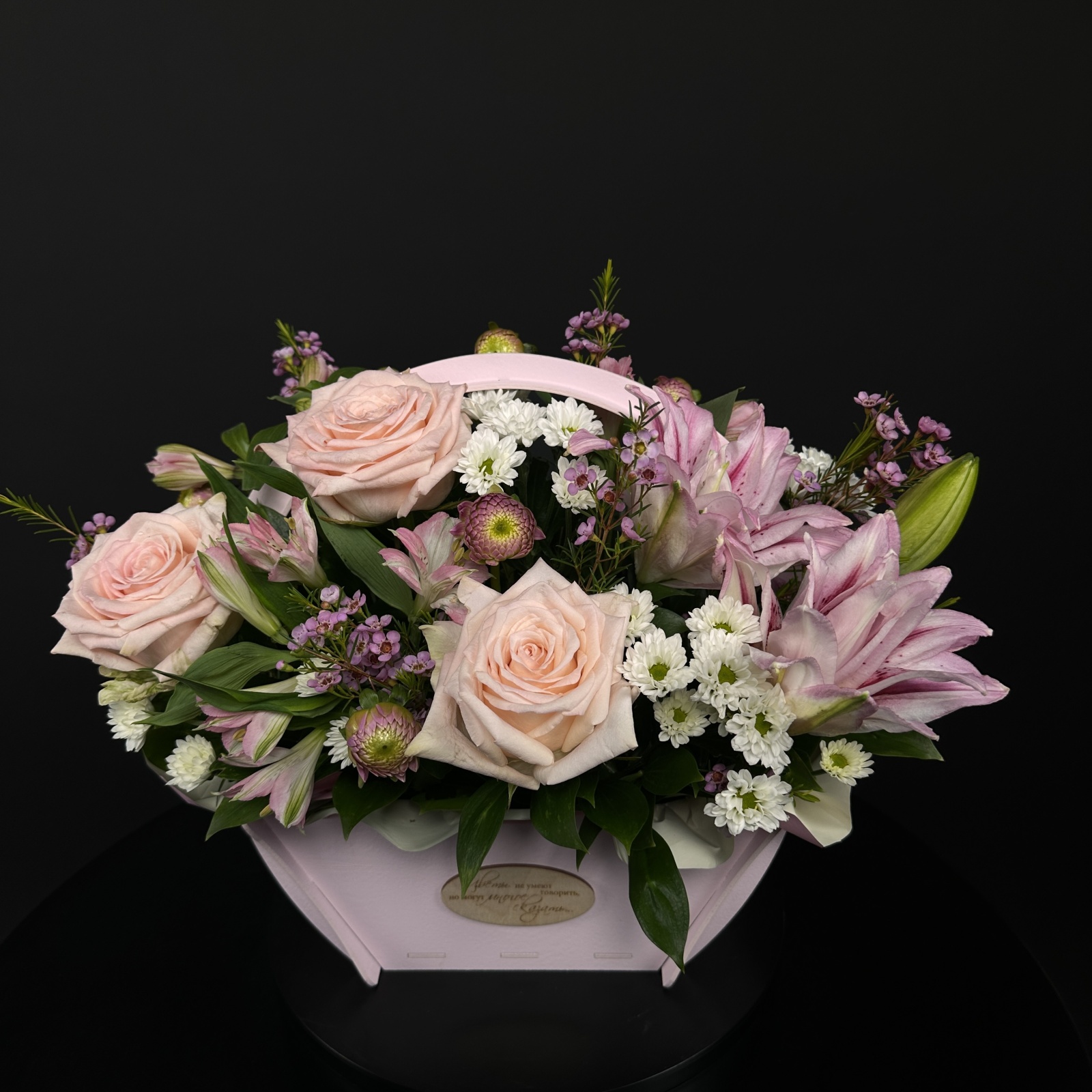 Состав: хризантема 3, роза 3, альстромерия 3, лилия 1, хамелациум 1, рускус 0,75 и прочее.