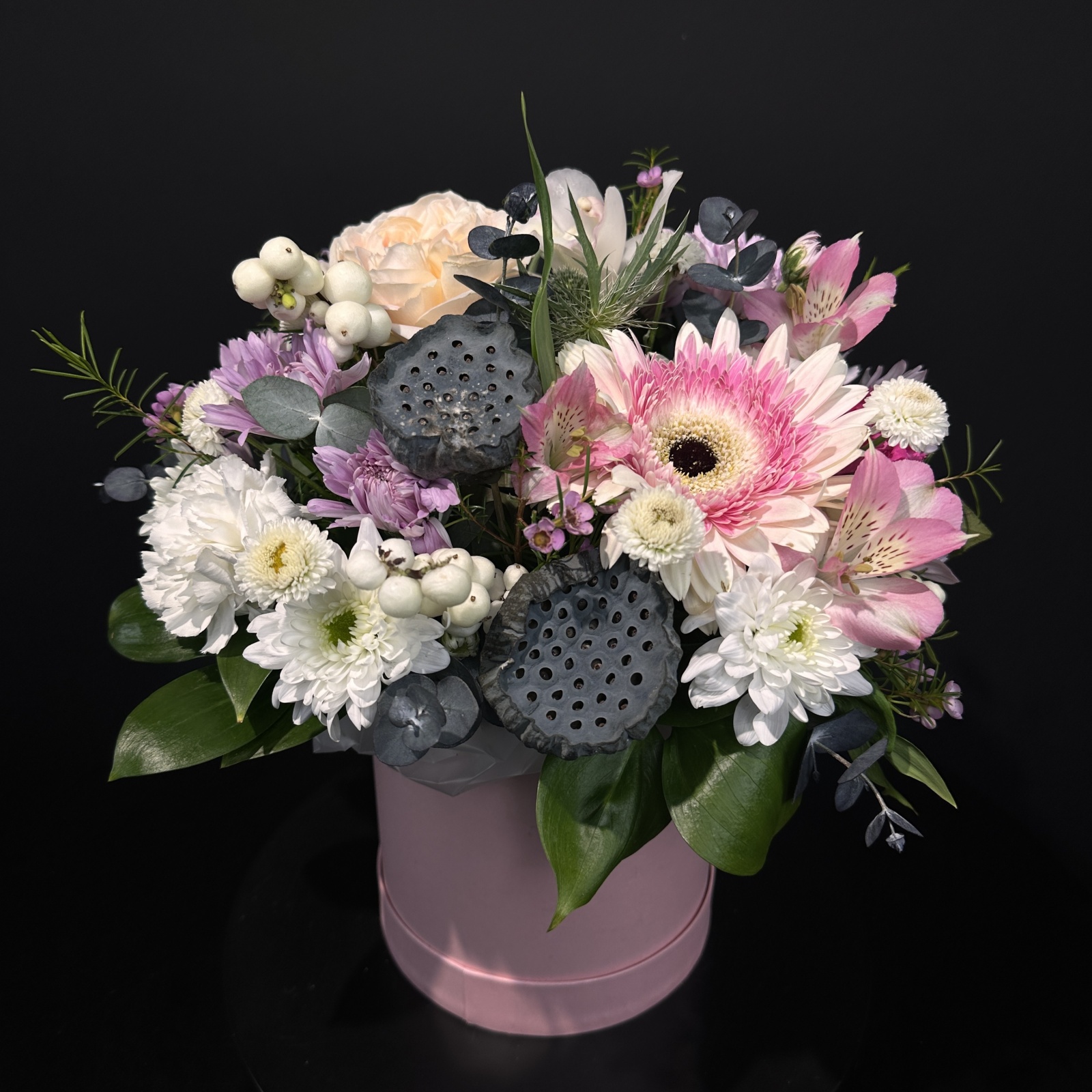 Состав: гвоздика 2, гербера 1, роза 1, ветка цимбидиум 0,1 и прочее. в наличии