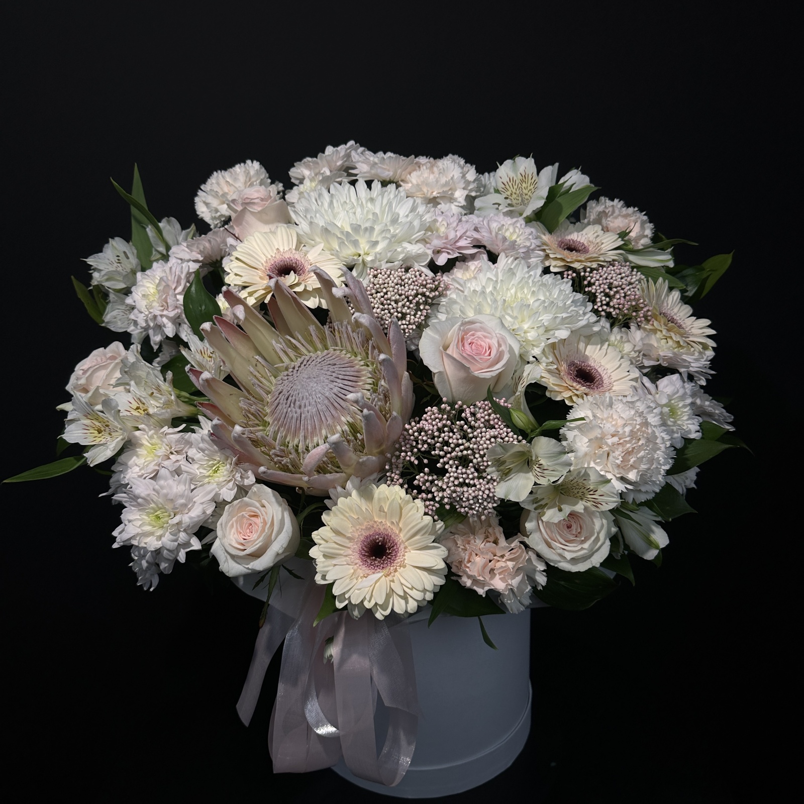 Состав: гербера 6, роза 5, гвоздика 5, хризантема кустовая 5, альстромерия 4, хризантема 3, рускус 0,7 и прочее.