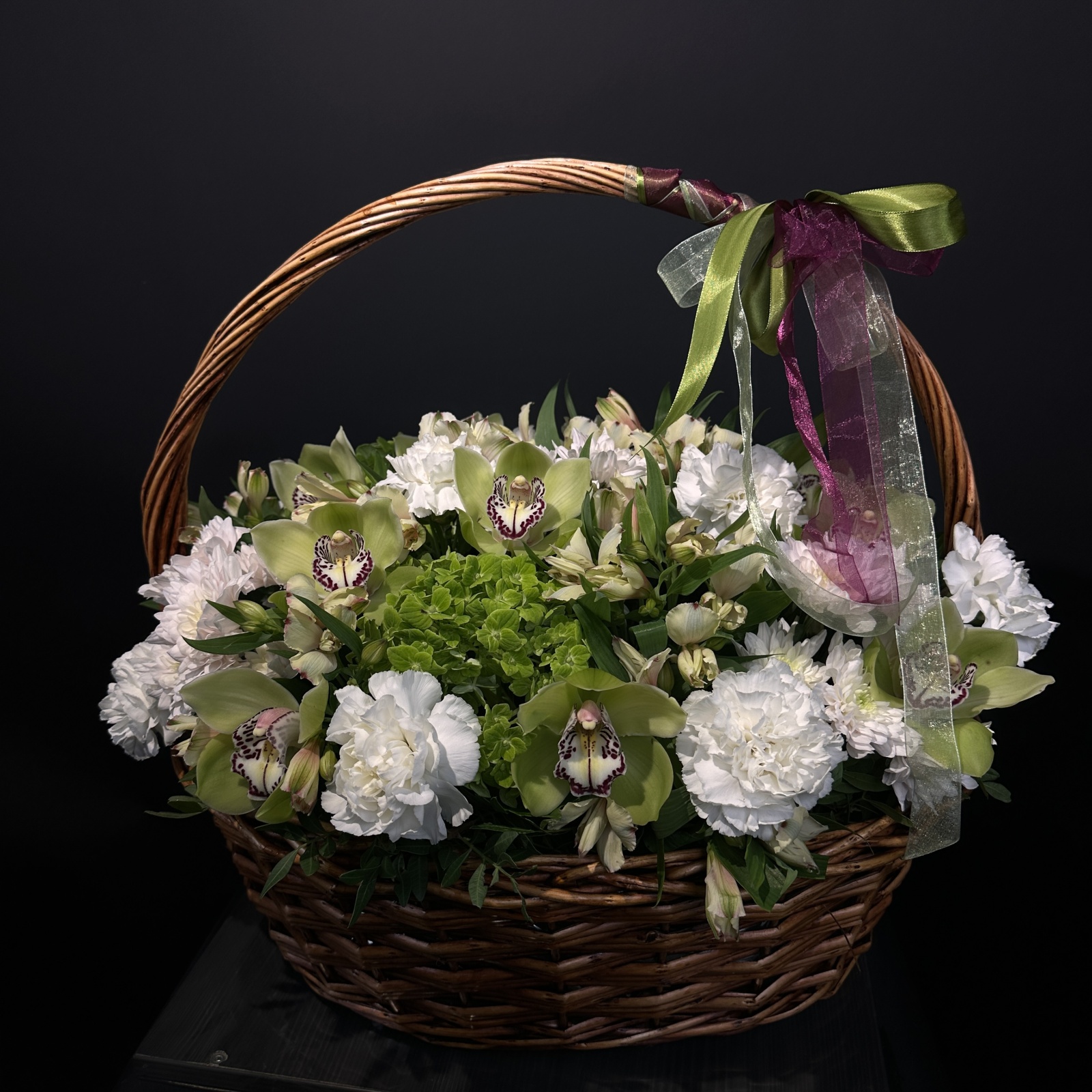 Состав: гвоздика 11, альстромерия 10, хризантема кустовая 5, гортензия 3, фисташка 1, ветка цимбидиум 0,5 и прочее.