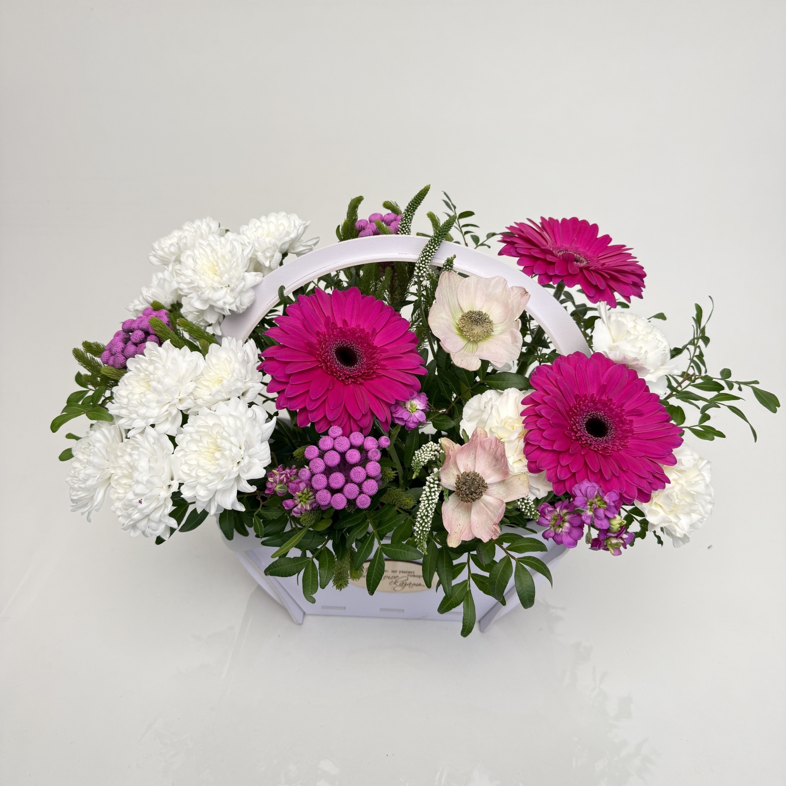 Состав: гербера 3, бруния 3, анемон 2, хризантема кустовая 2, фисташка 1 и прочее. в наличии