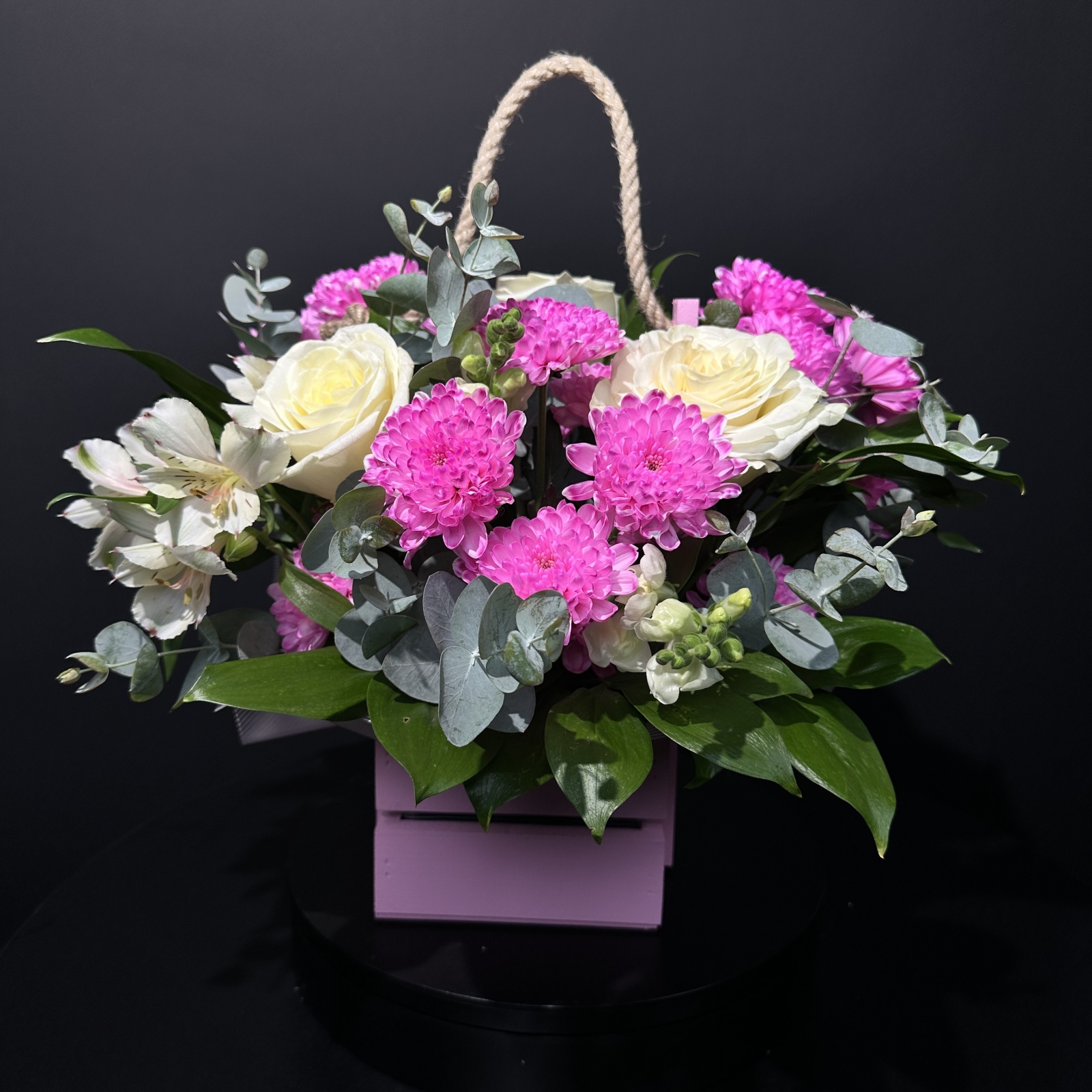 Состав: роза 3, хризантема кустовая 2, антирринум 2, лизиантус 2, эвкалипт 1, альстромерия 1 и прочее. под заказ