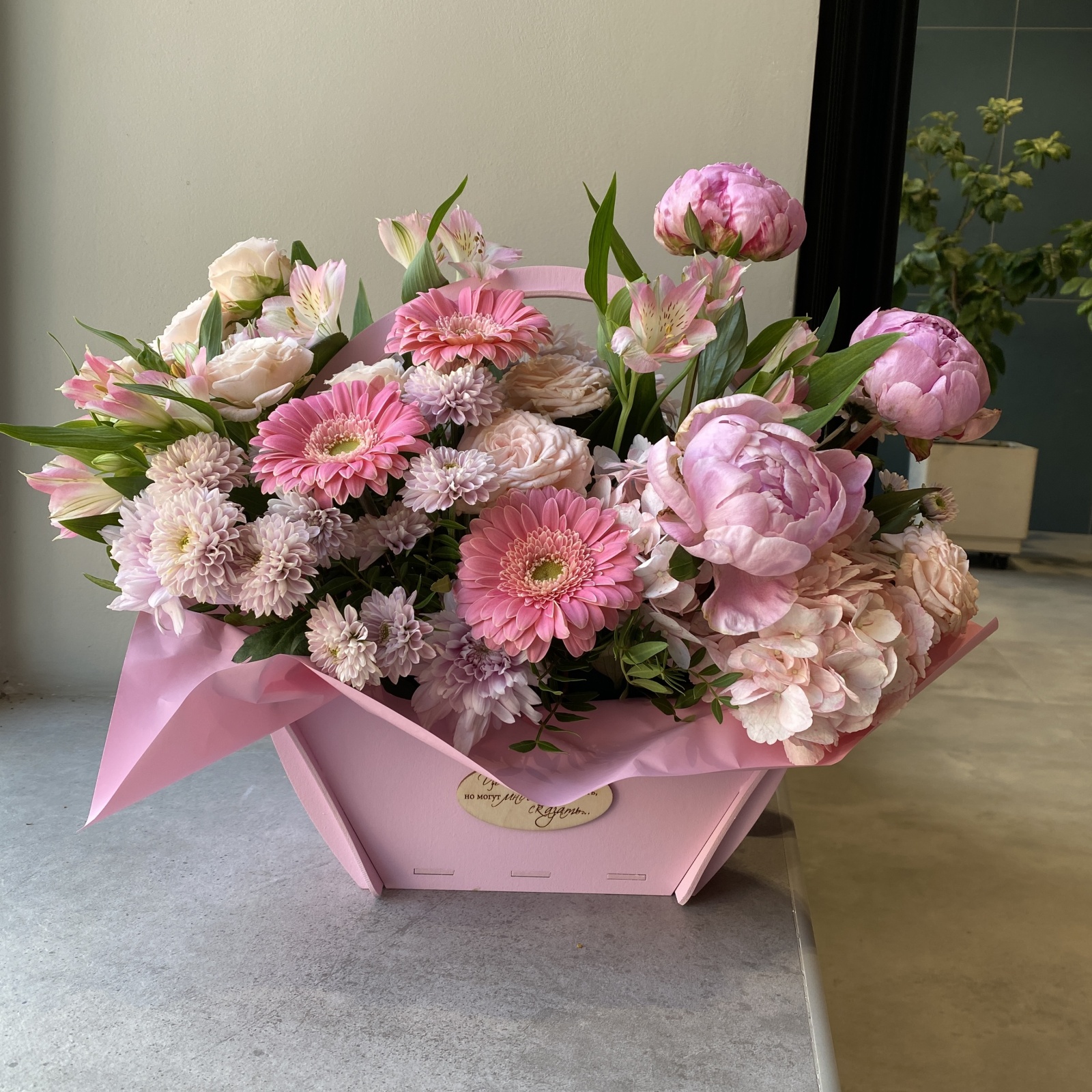 Состав: хризантема кустовая 4, гербера 3, альстромерия 3, пион 3, роза кустовая 1, гортензия 1, фисташка 0,3 и прочее. под заказ