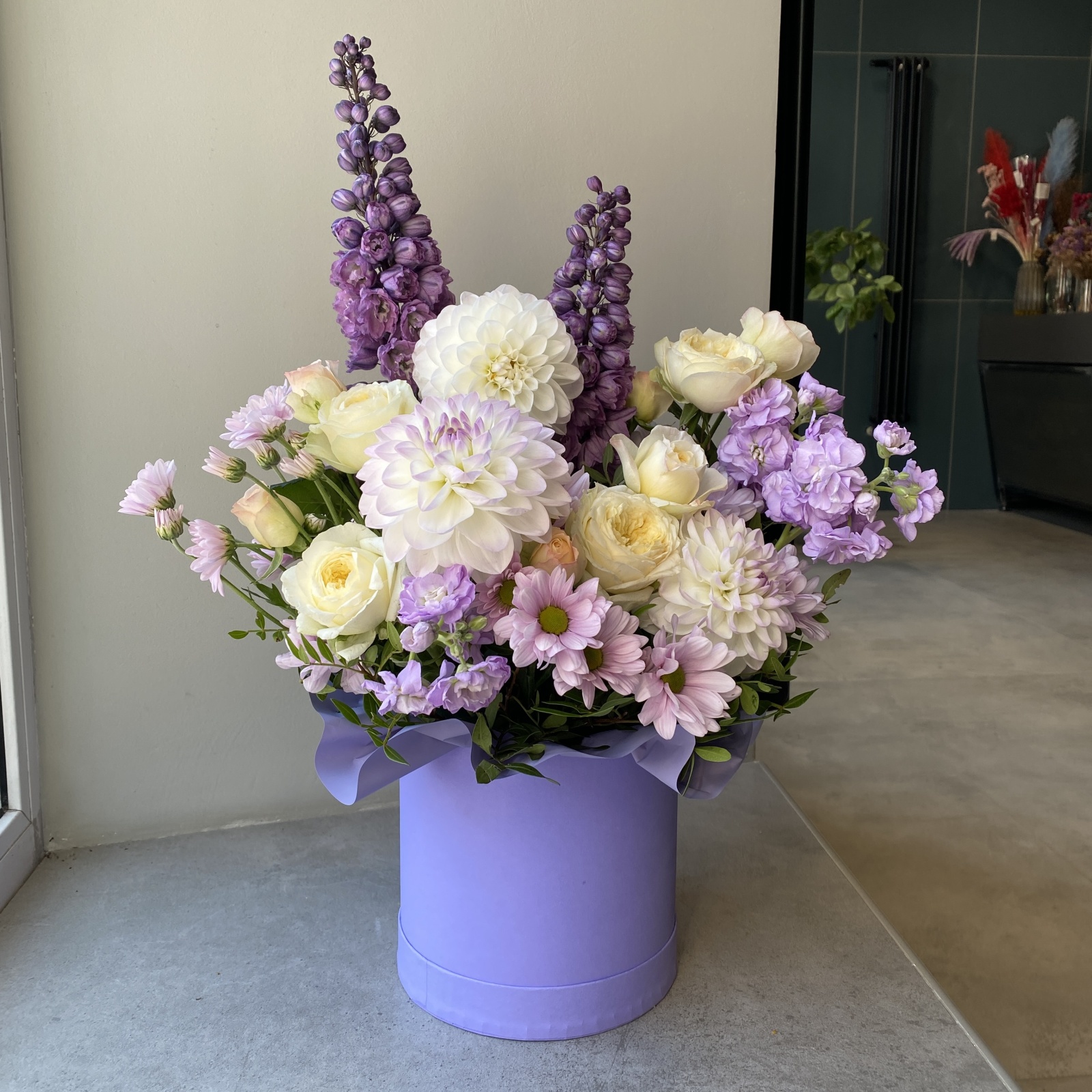 Состав: хризантема кустовая 2, дельфиниум 2, маттиола 1, роза кустовая 1, фисташка 0,5 и прочее. под заказ