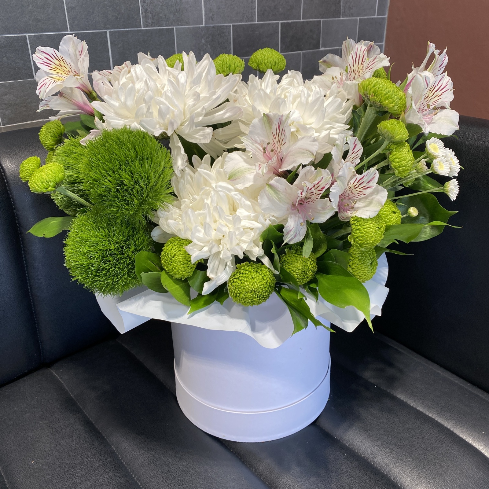 Состав: хризантема кустовая 5, хризантема 3, альстромерия 3, рускус 0,5 и прочее.