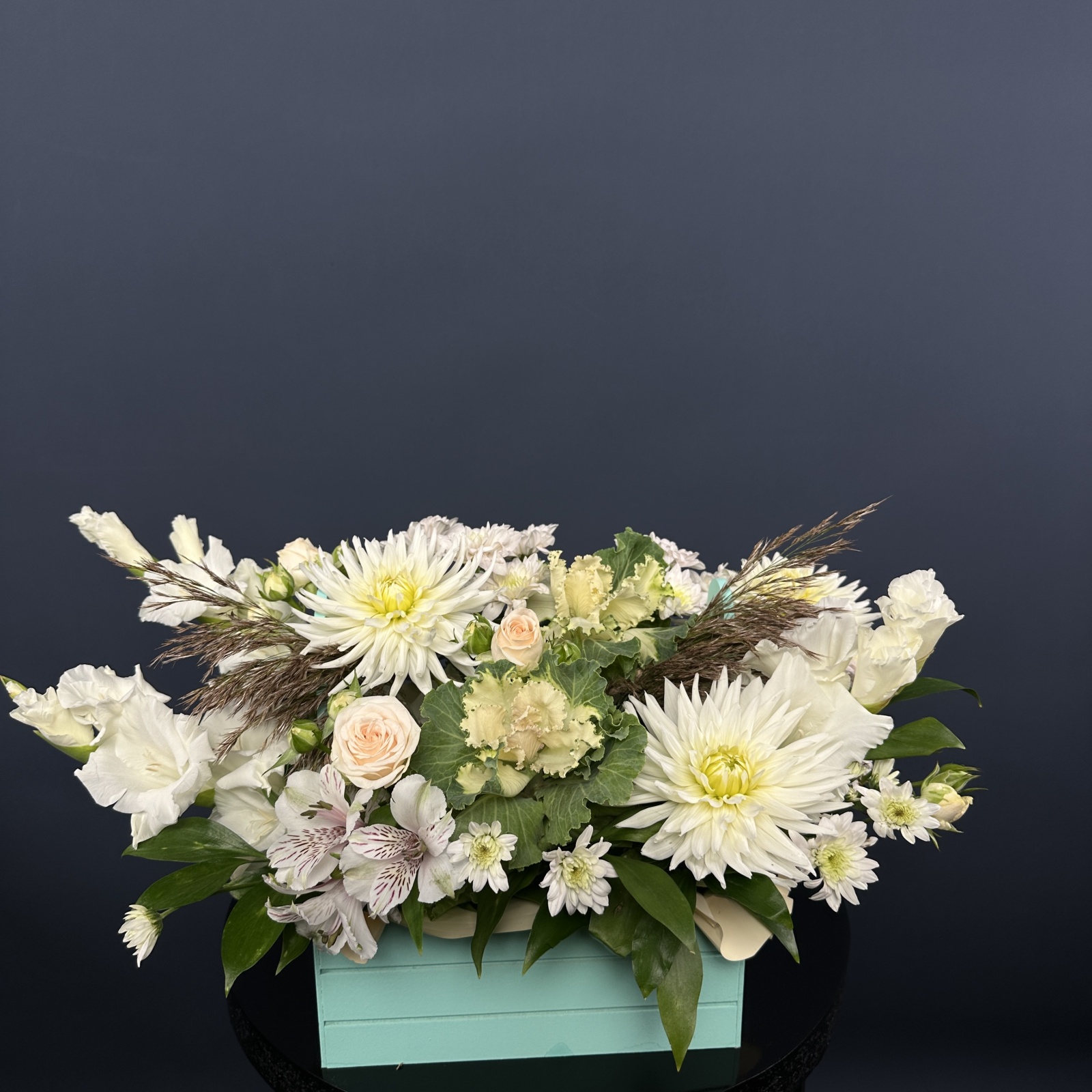 Состав: гладиолус 3, хризантема кустовая 2, альстромерия 1, рускус 0,5 и прочее. под заказ