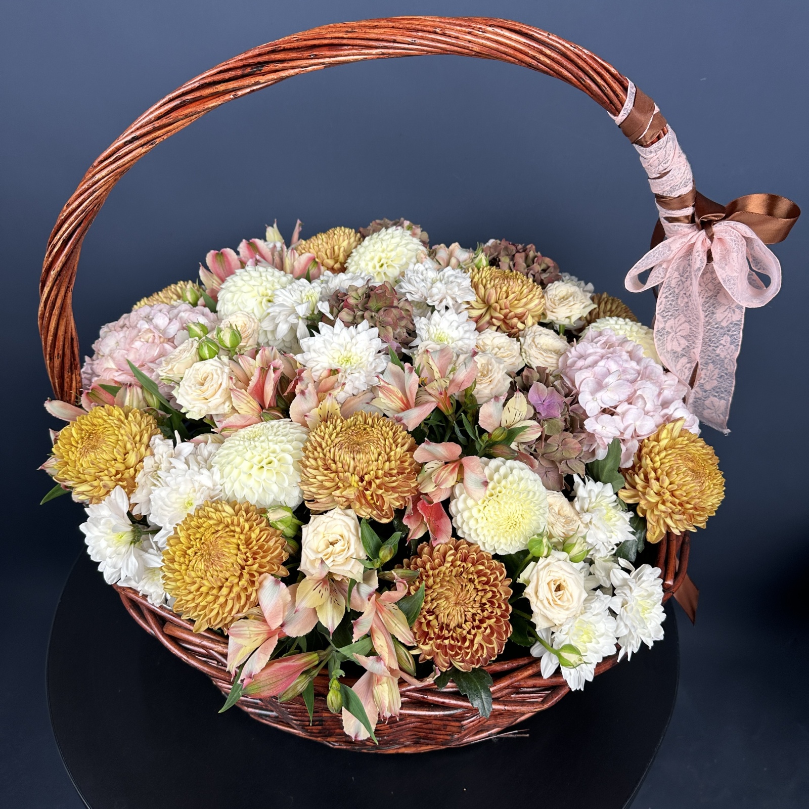 Состав: хризантема 10, альстромерия 7, хризантема кустовая 5, гортензия 4, роза кустовая 3, рускус 0,3 и прочее. под заказ