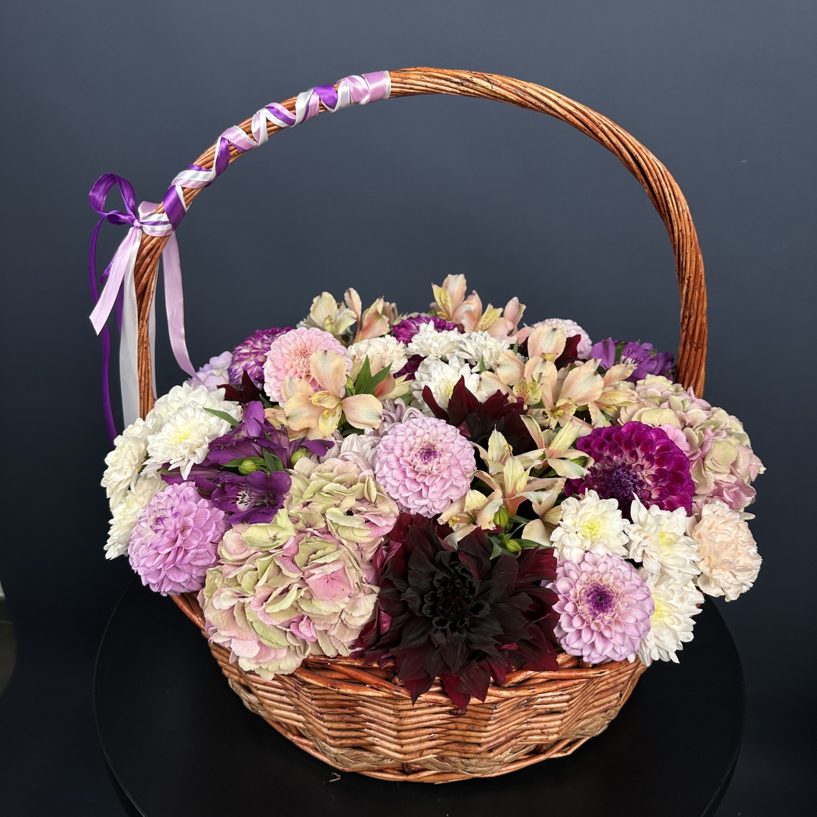 Состав: альстромерия 8, хризантема кустовая 5, гортензия 4, хризантема 2 и прочее.