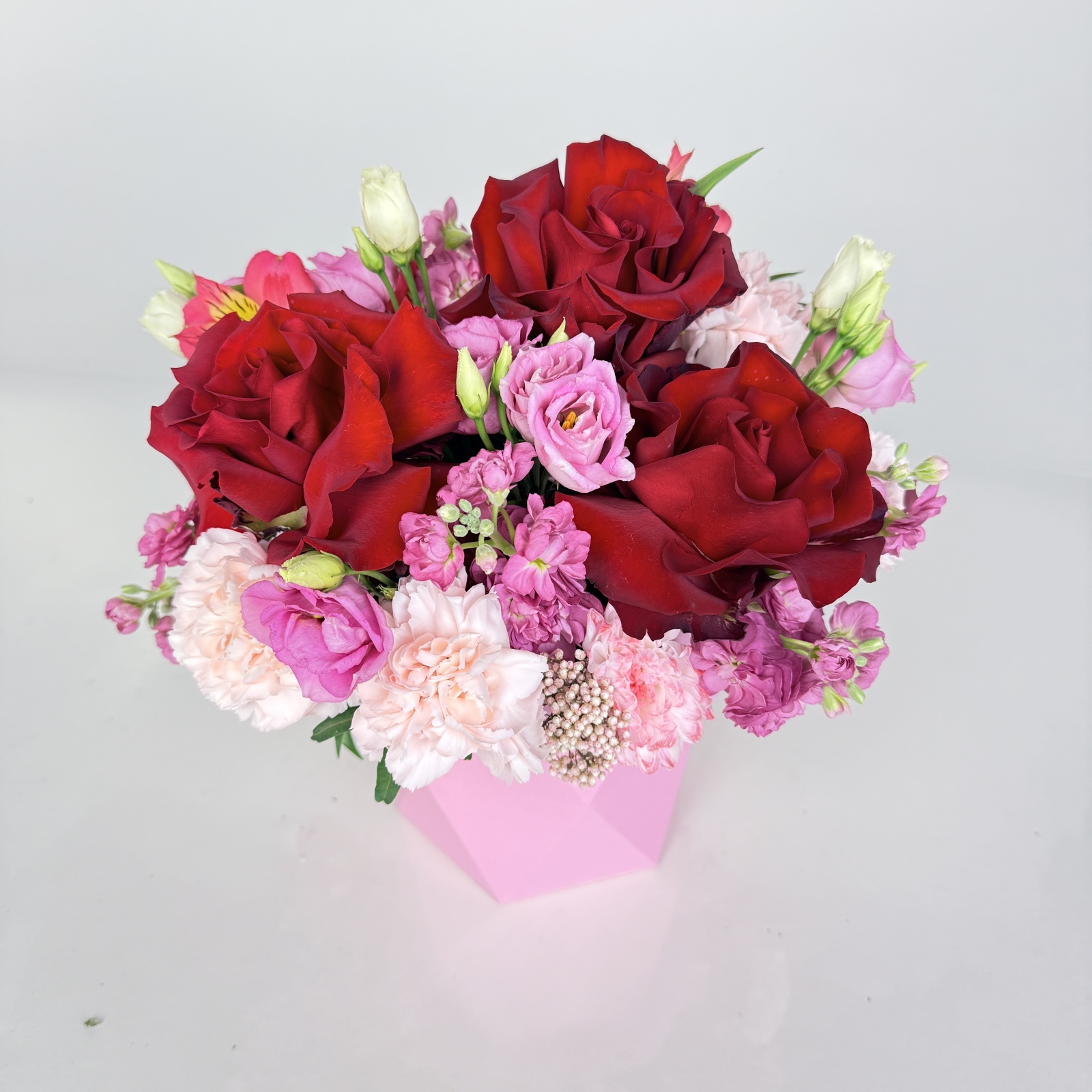 Состав: гвоздика 5, роза 4, альстромерия 2, лизиантус 1, маттиола 1 и прочее. в наличии