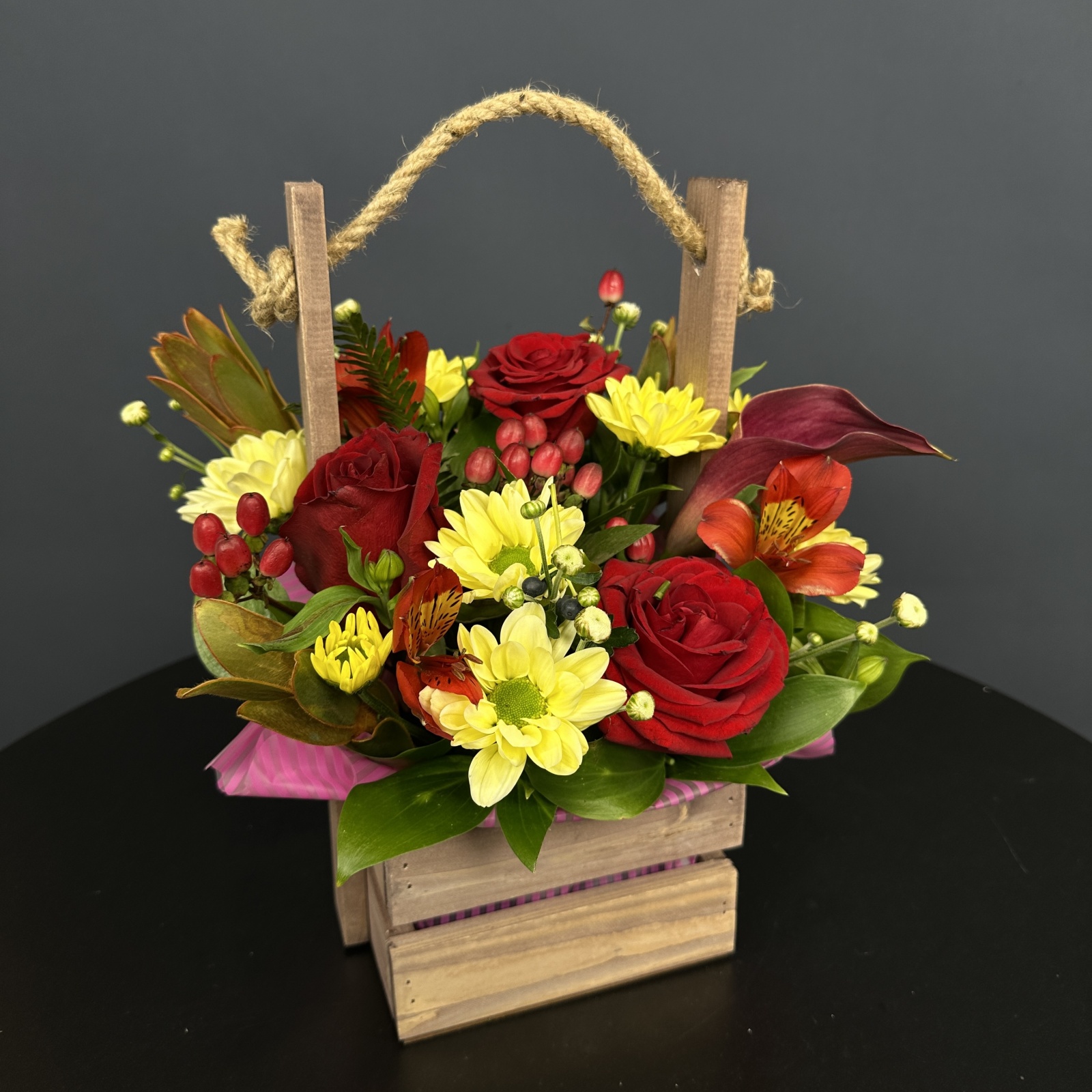 Состав: роза 2, леукадендрон 2, альстромерия 1, хризантема кустовая 1, гиперикум 1 и прочее.