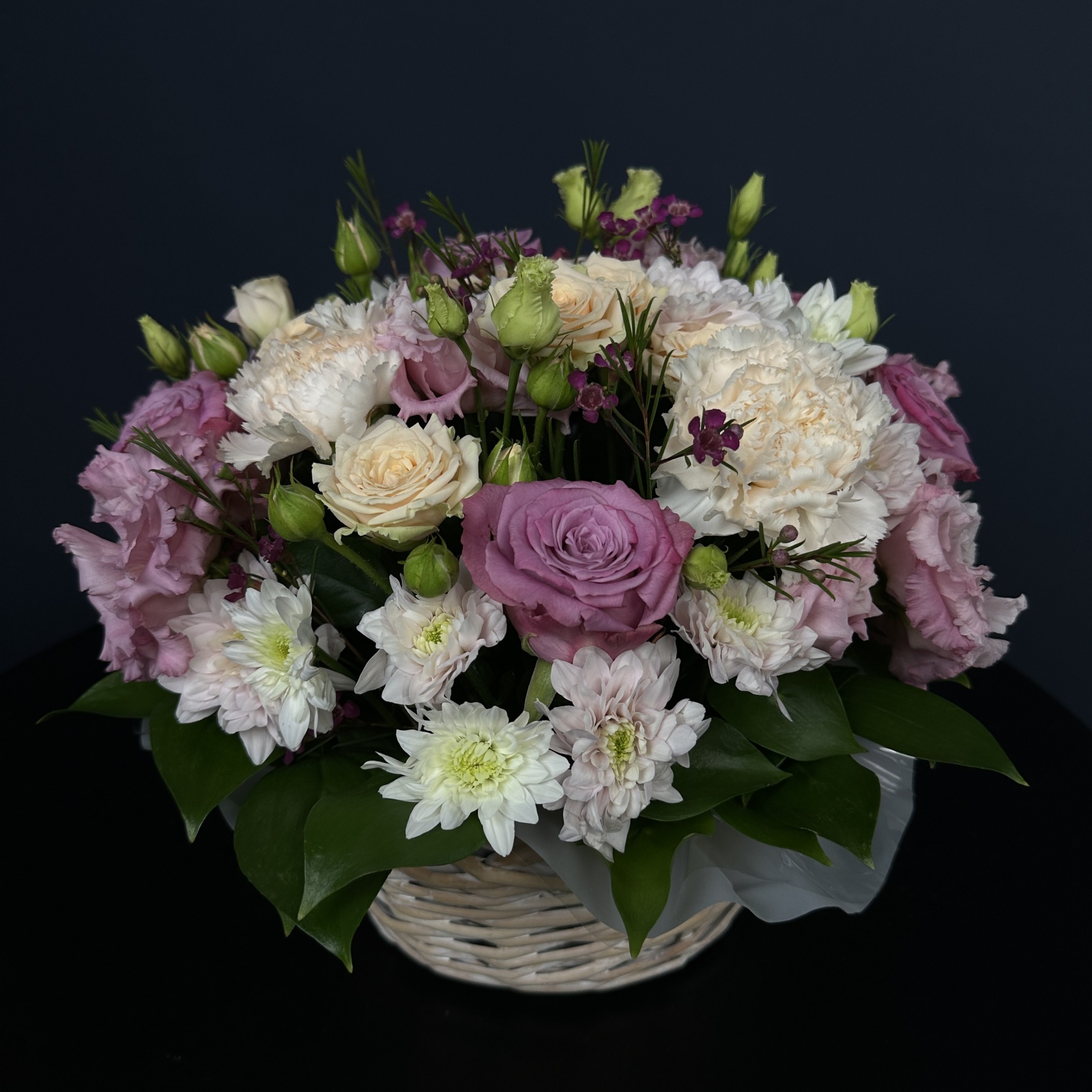 Состав: роза 7, гвоздика 3, лизиантус 2, хамелациум 1, роза кустовая 1, хризантема кустовая 1, рускус 0,5 и прочее. под заказ