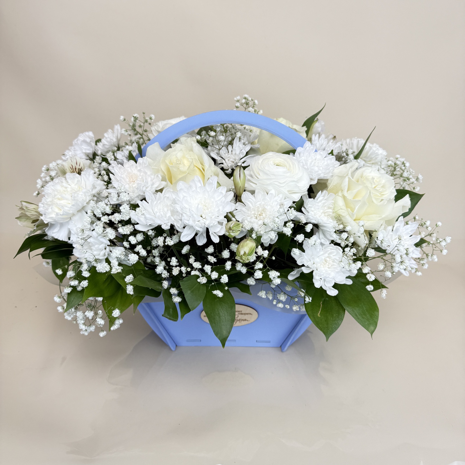 Состав: хризантема кустовая 3, роза 3, альстромерия 3, гвоздика 2, гипсофила 2, ранункулюс 2 и прочее. под заказ