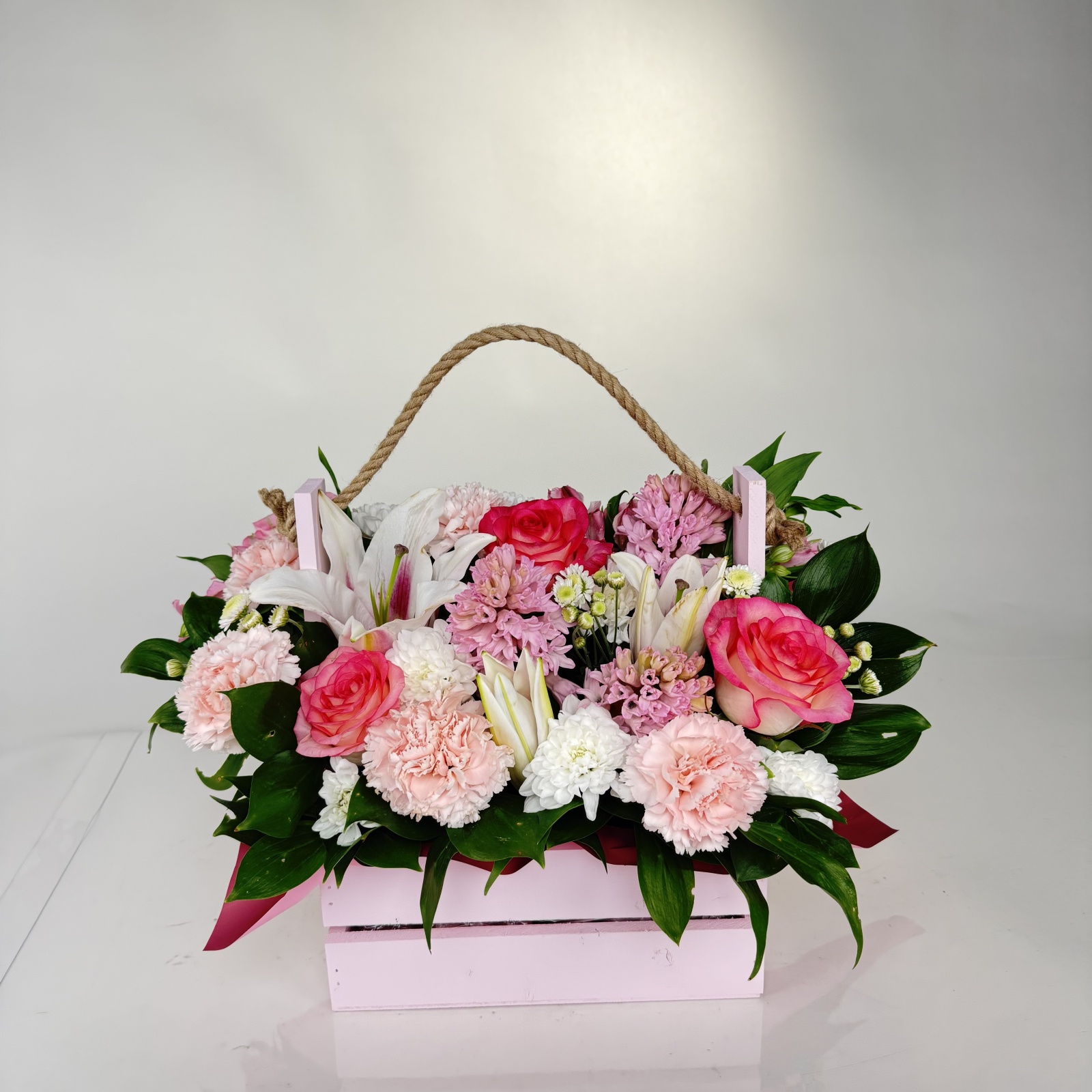 Состав: альстромерия 5, гвоздика 5, роза 4, гиацинт 3, гербера 2, хризантема кустовая 1, рускус 0,5 и прочее. под заказ