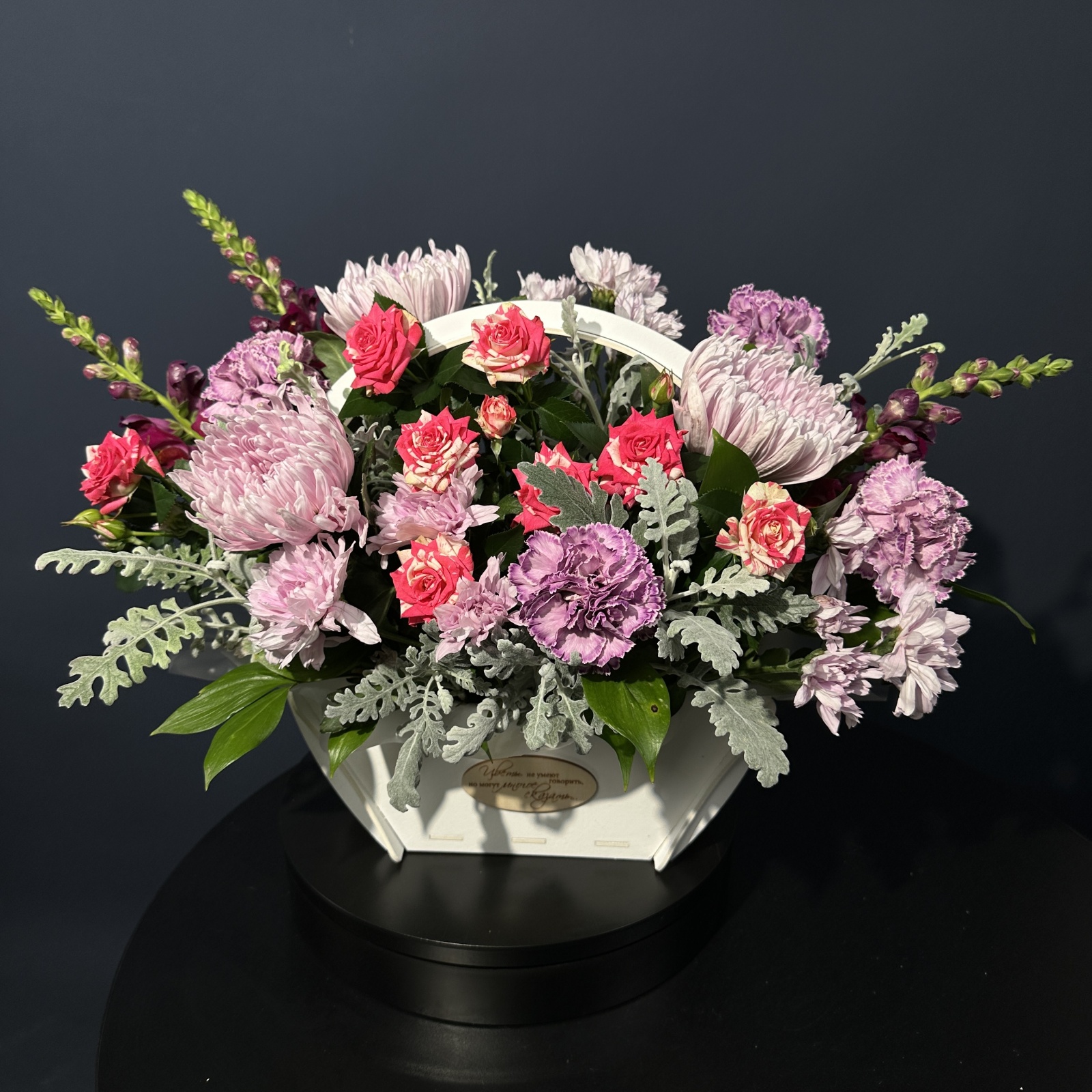 Состав: гвоздика 4, хризантема кустовая 3, антирринум 3, хризантема 3, роза кустовая 1, рускус 0,5 и прочее.