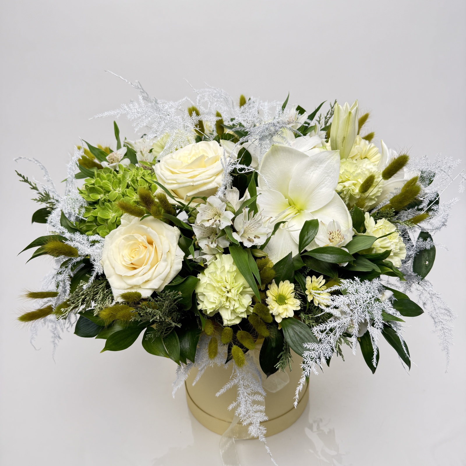 Состав: гвоздика 6, альстромерия 5, роза 3, хризантема кустовая 2, гортензия 1, лилия 1, рускус 0,5 и прочее. под заказ