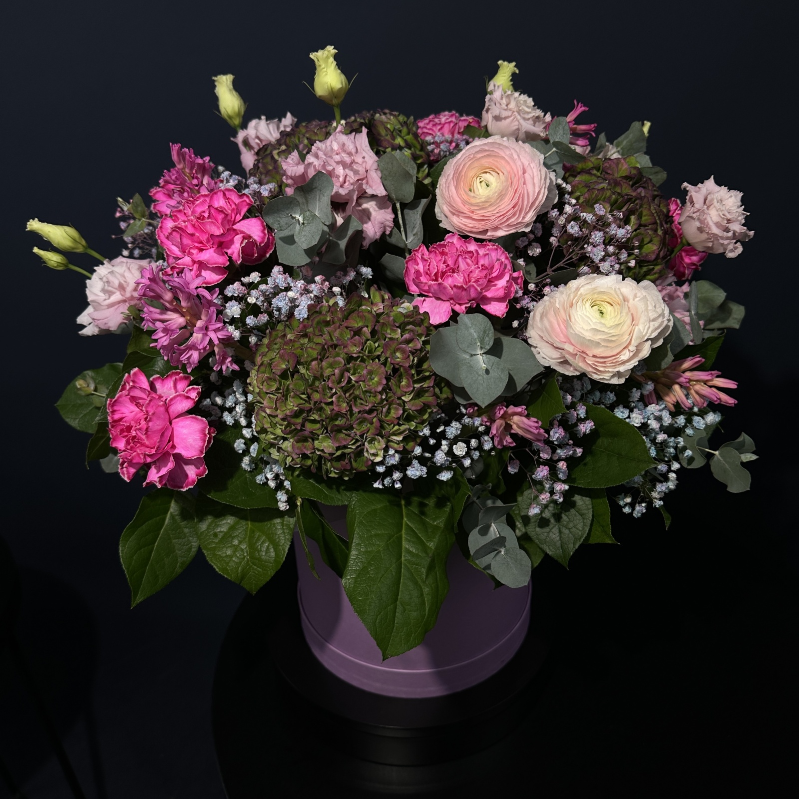 Состав: гвоздика 7, гортензия 3, гиацинт 3, ранункулюс 3, эвкалипт 3, лизиантус 2, вибурнум 2, салал 0,6 и прочее.
