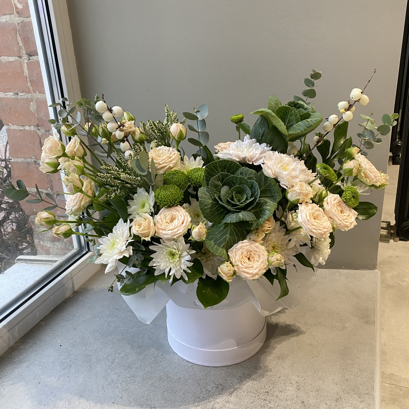 Состав: роза кустовая 1, хризантема кустовая 1, эвкалипт 1, рускус 0,5 и прочее. под заказ