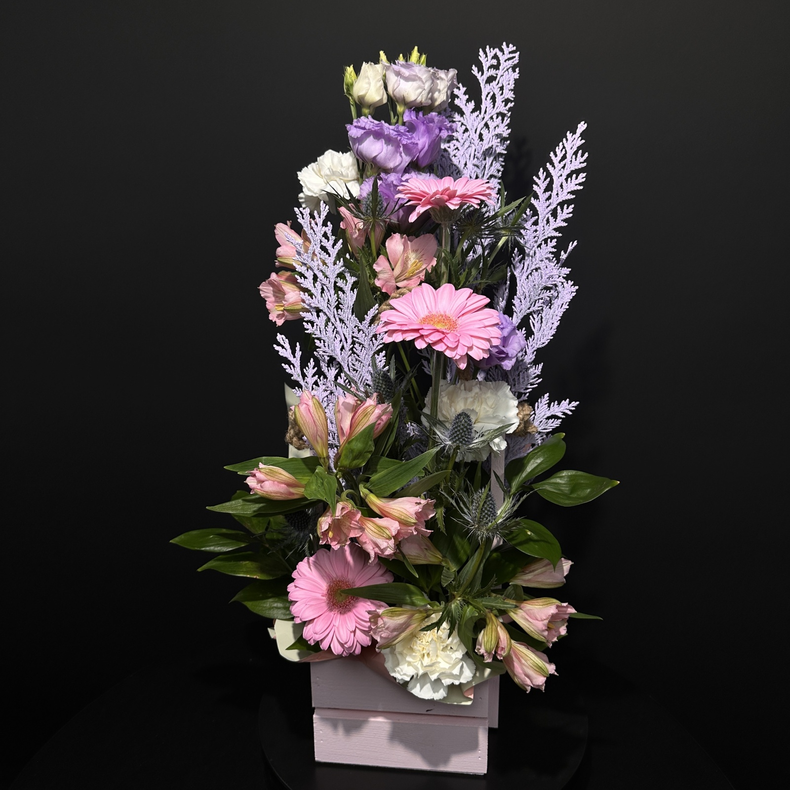 Состав: альстромерия 3, гвоздика 3, гербера 3, эрингиум 2, роза 1, лизиантус 1 и прочее. под заказ