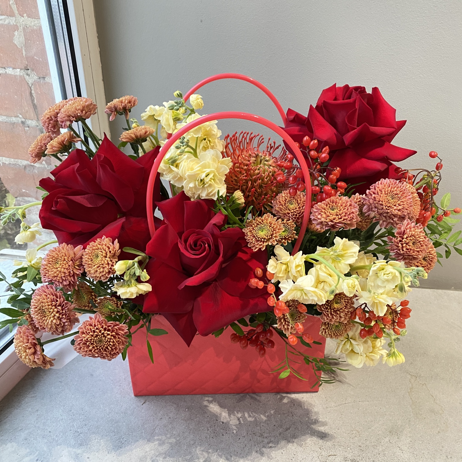 Состав: хризантема 3, роза 3, маттиола 2, гиперикум 1, фисташка 0,4 и прочее. под заказ