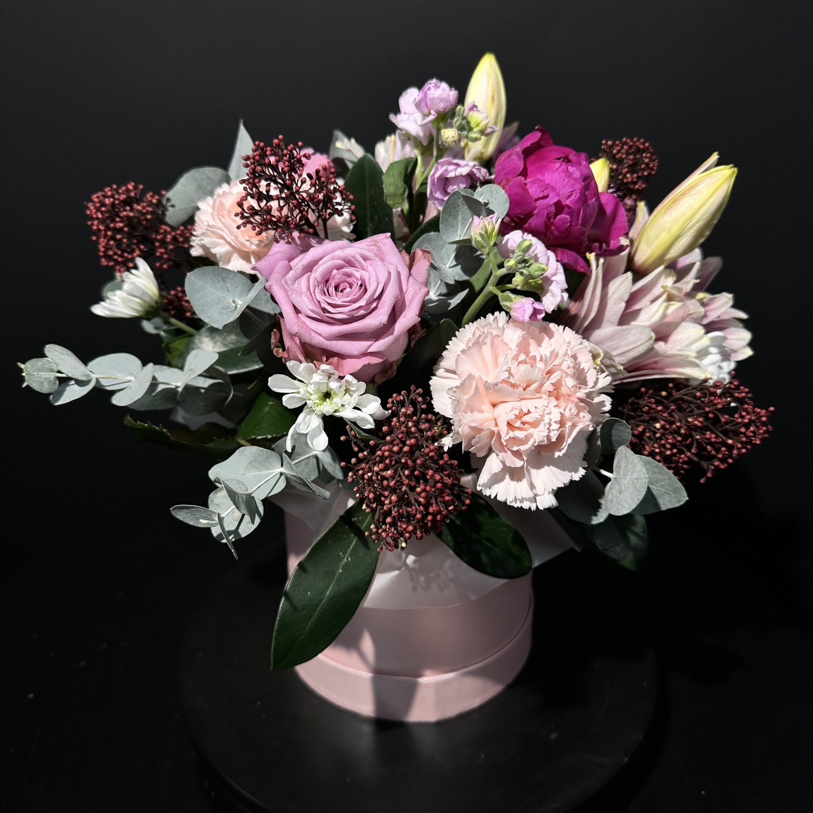 Состав: гвоздика 3, эвкалипт 3, роза 2, хризантема кустовая 2, лилия 2, пион 1 и прочее. в наличии