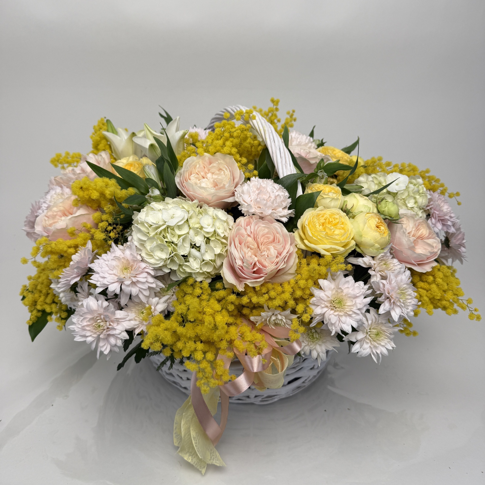 Состав: роза 8, хризантема кустовая 7, гортензия 6, альстромерия 4, гвоздика 3, роза кустовая 3, лилия 2 и прочее. в наличии