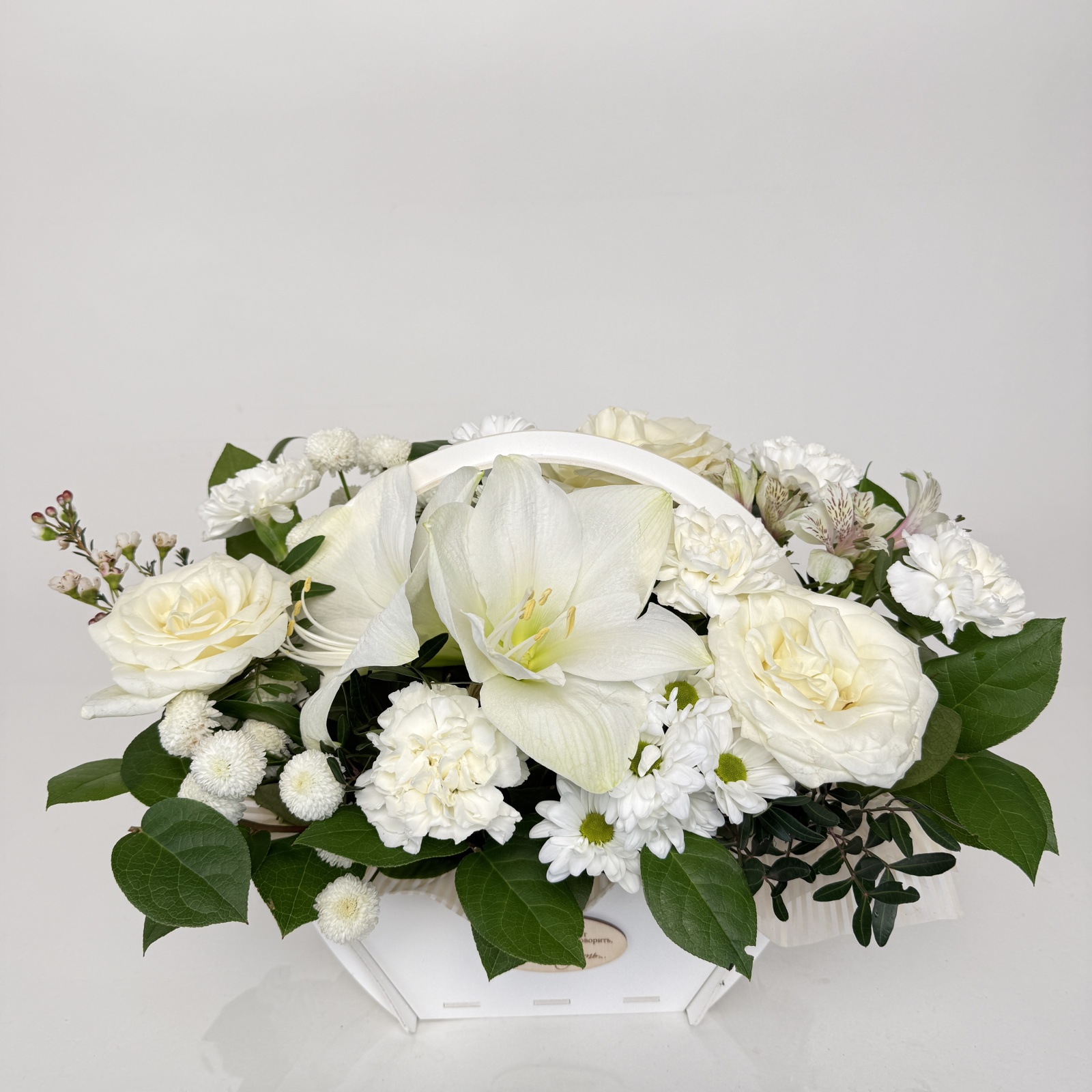 Состав: гвоздика 5, хризантема кустовая 4, роза 3, альстромерия 1, салал 0,3 и прочее.