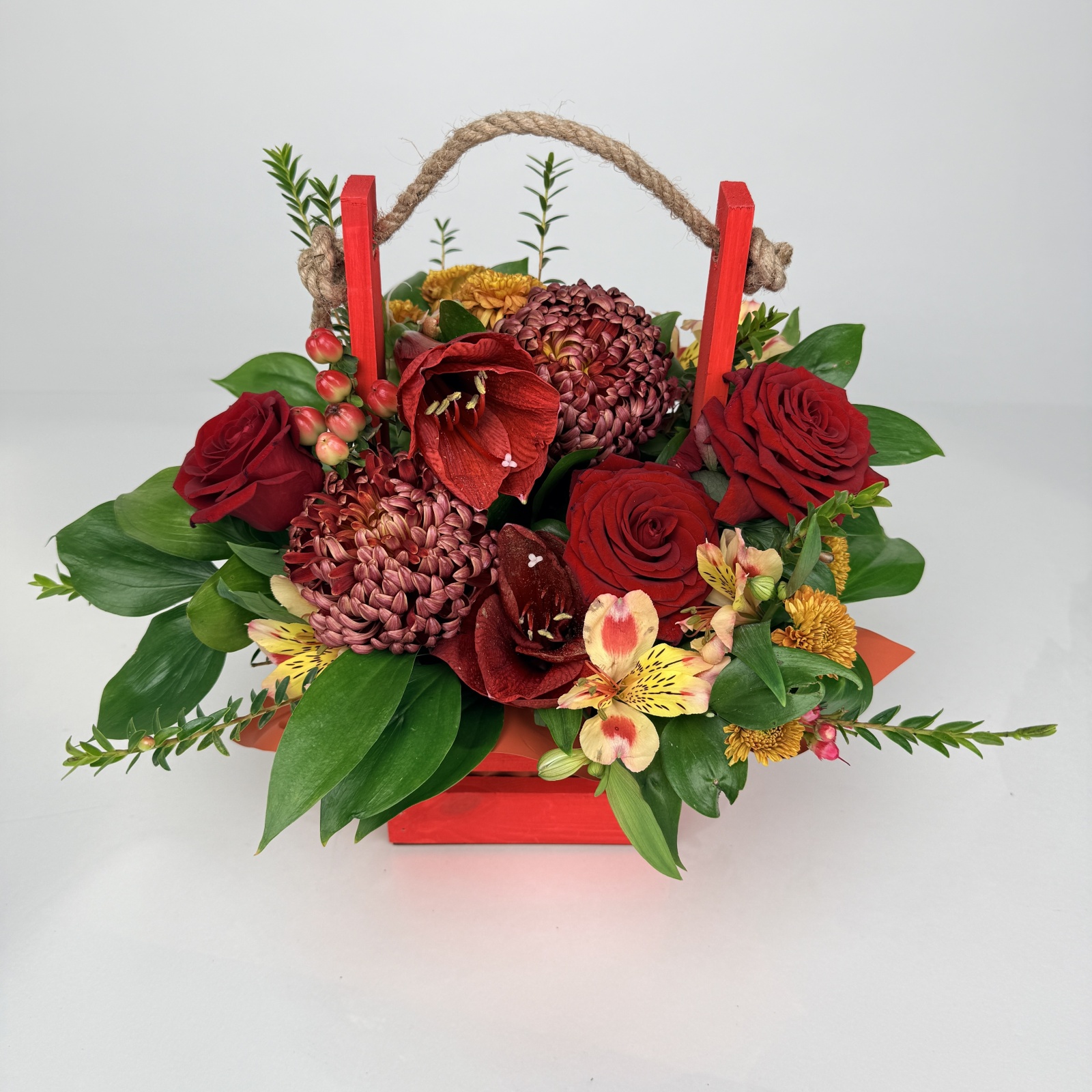 Состав: роза 3, альстромерия 2, хризантема 2, хризантема кустовая 1, гиперикум 1 и прочее. в наличии