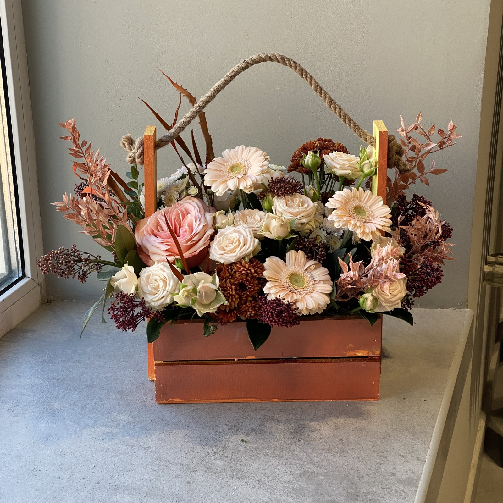 Состав: гербера 3, рускус 2, хризантема 2, роза 1, роза кустовая 1, хризантема кустовая 1, фисташка 0,1 и прочее. под заказ