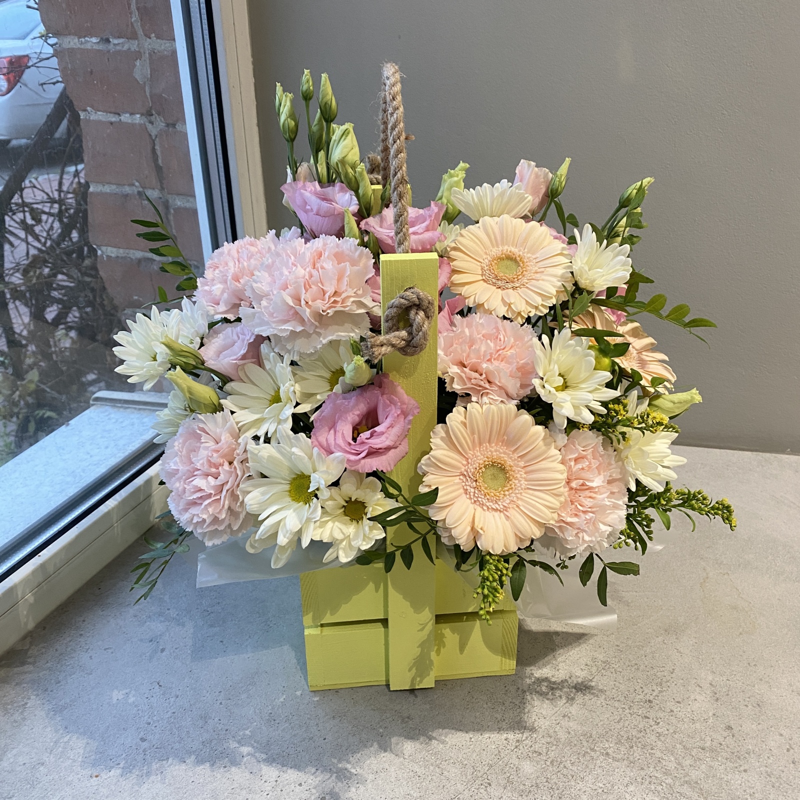 Состав: гвоздика 5, гербера 3, хризантема кустовая 2, лизиантус 1, солидаго 1, фисташка 0,2 и прочее. под заказ
