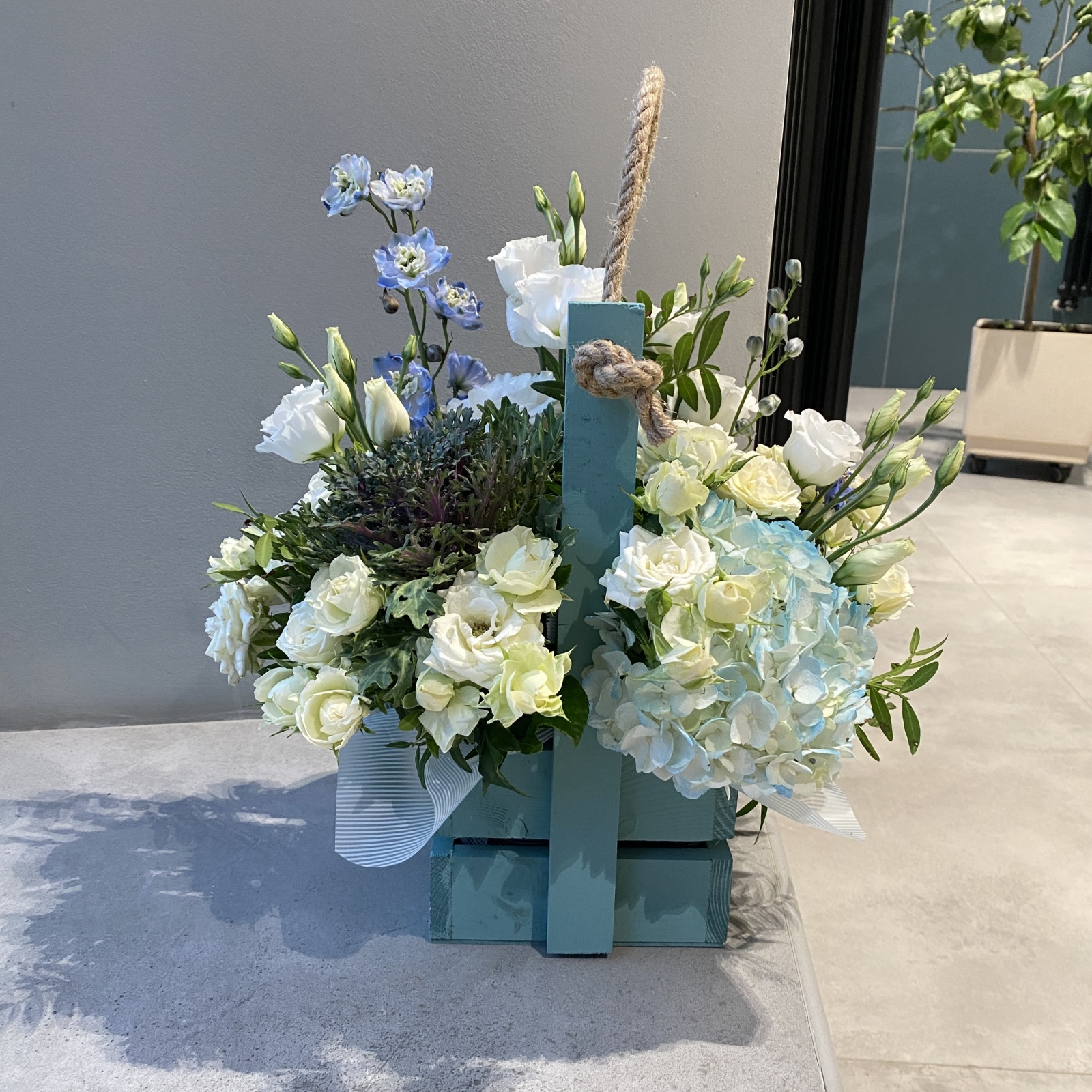 Состав: роза кустовая 2, гортензия 1, дельфиниум 1, лизиантус 1, фисташка 0,3 и прочее. под заказ