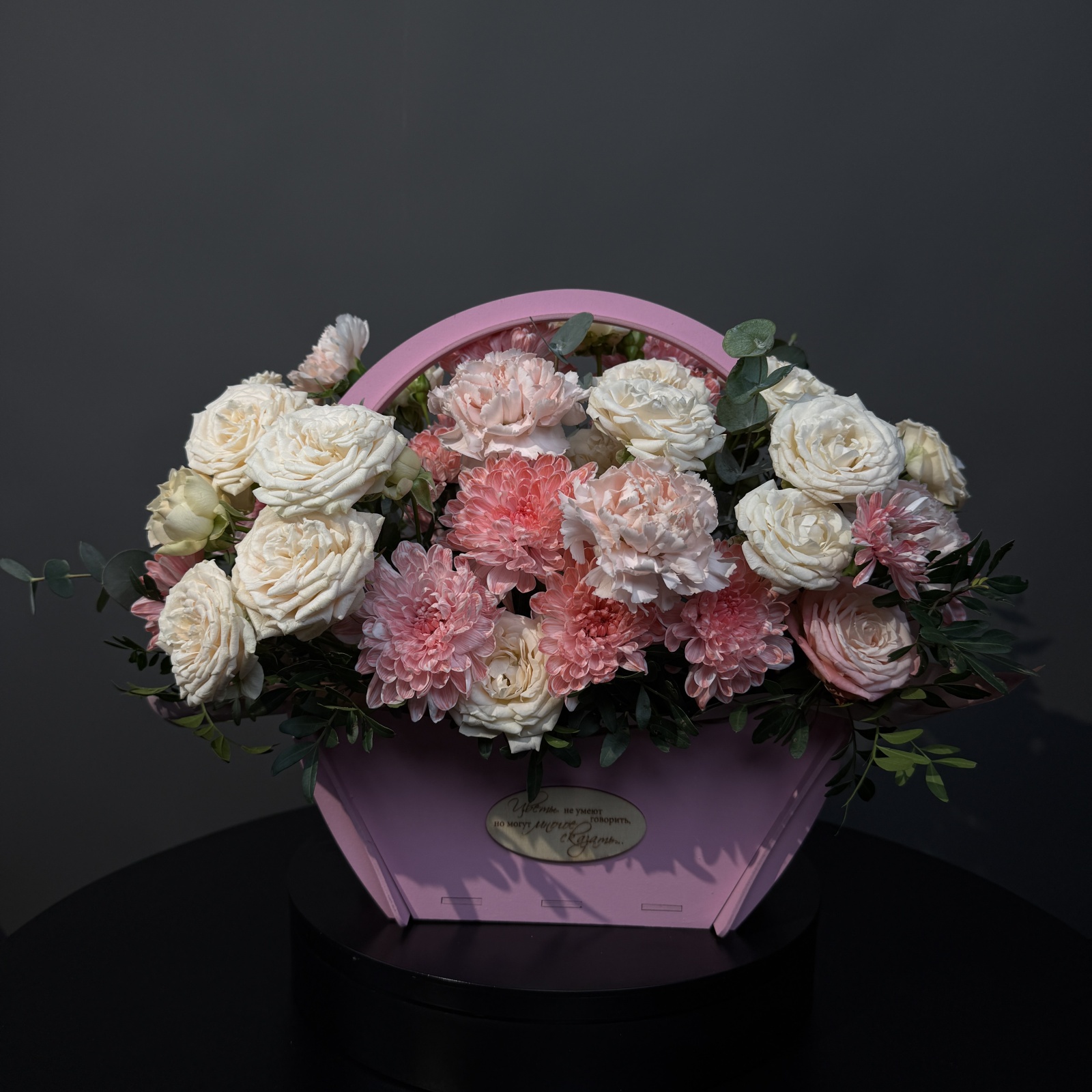 Состав: гвоздика 5, роза кустовая 3, хризантема кустовая 3, эвкалипт 1, фисташка 0,5 и прочее.